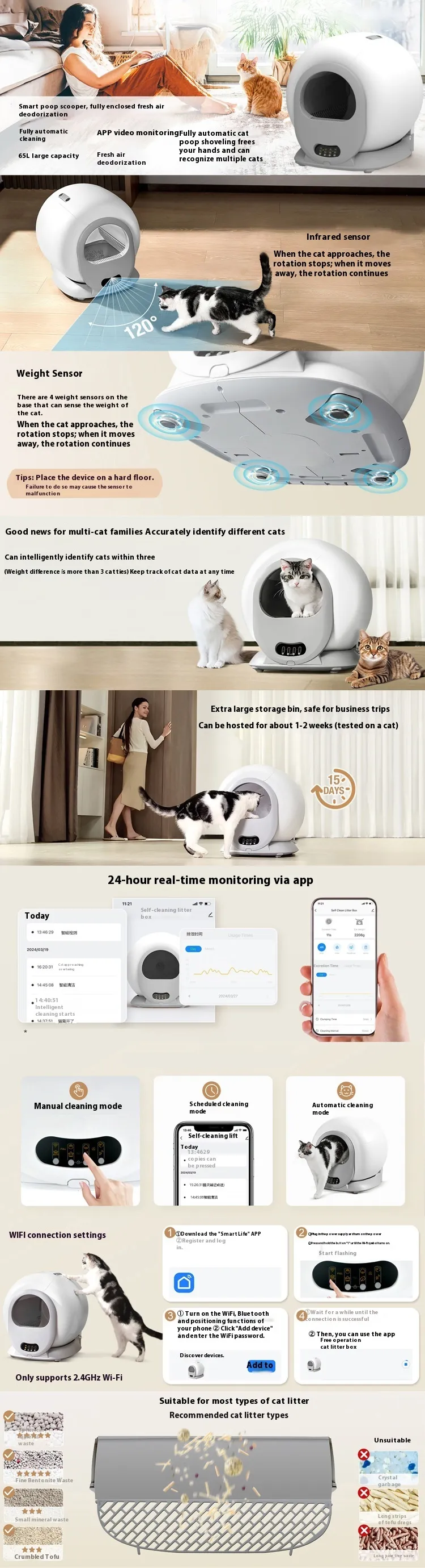 - App-Controlled Monitoring: Connects to the "Smart Life" app via 2.4G Wi-Fi, allowing you to monitor your cat's weight, usage frequency, and litter capacity in real-time, ensuring your pet's health and safety.