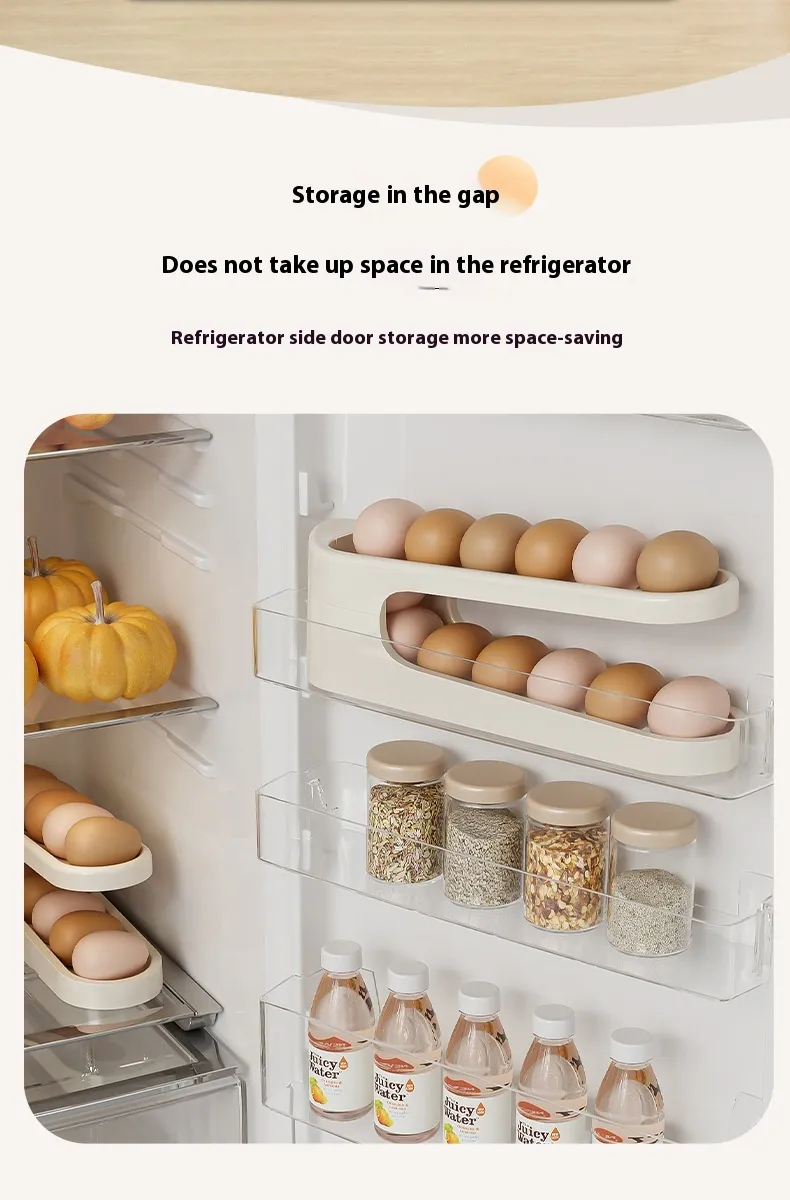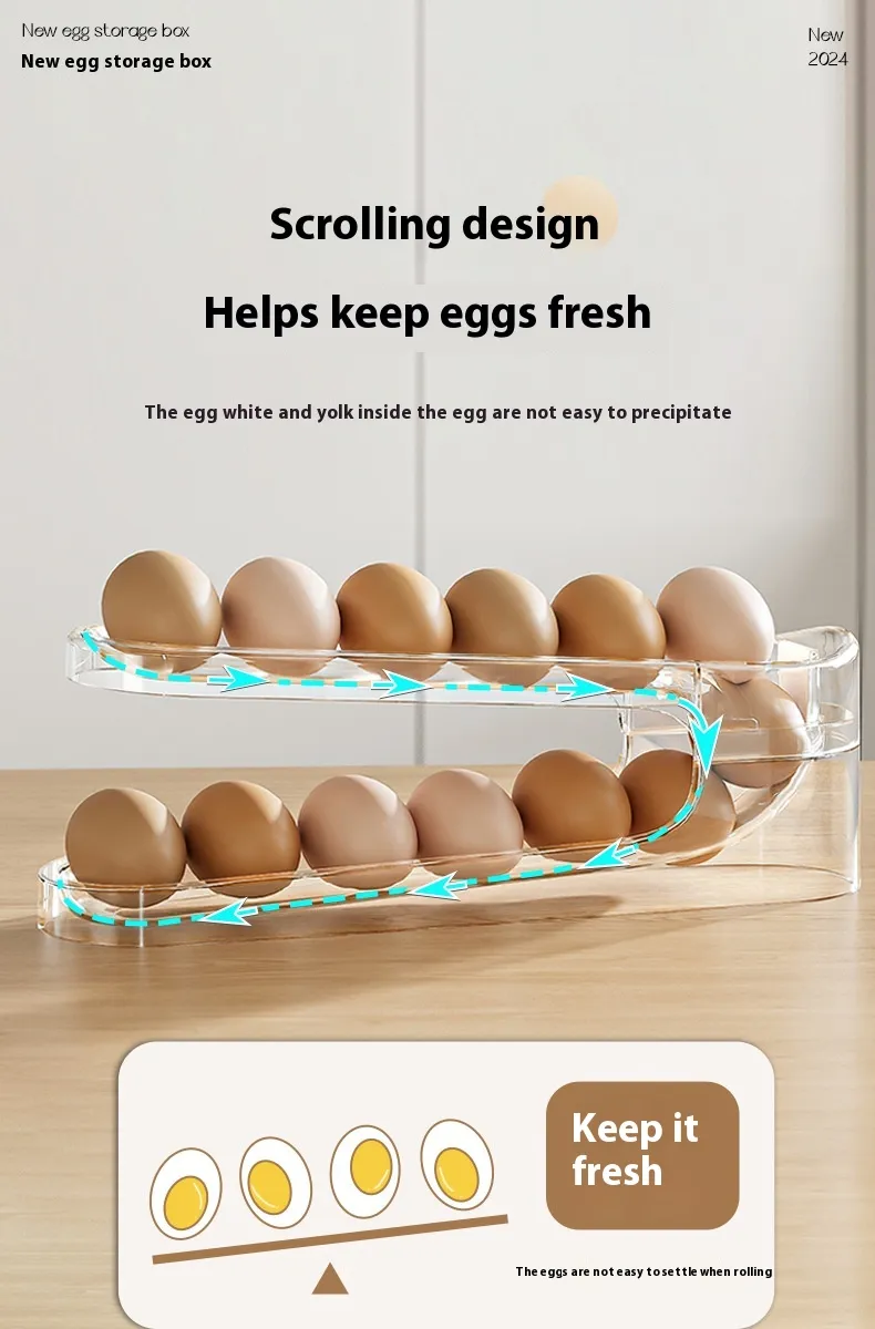 The Automatic Scrolling Egg Rack is the perfect solution for keeping your eggs organized, fresh, and easily accessible in your fridge. Designed for convenience and efficiency, this innovative storage rack allows you to store your eggs in a way that ensures they stay secure while making it easy to access the ones you need. With its automatic scrolling mechanism, the rack efficiently rotates eggs, keeping them fresh and allowing you to use older eggs first, promoting better organization and reducing waste.