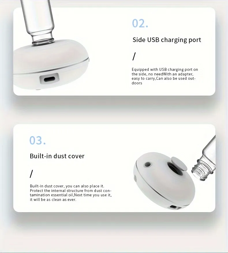 This mini USB-powered diffuser is highly convenient and eco-friendly. Simply plug it into any USB port – whether it’s your laptop, power bank, or wall adapter – to enjoy continuous fragrance throughout your day.
