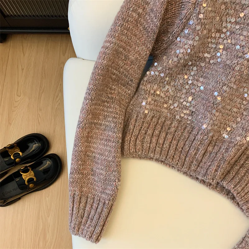 Autumn And Winter New Round Neck Heavy Embroidery Sequins Knitwear Top For Women