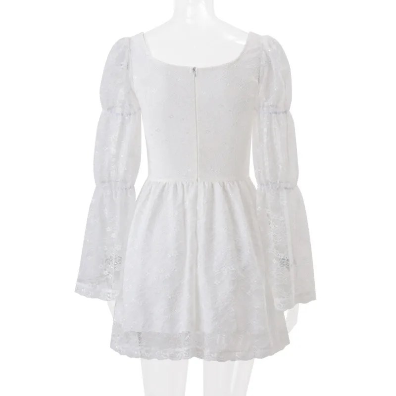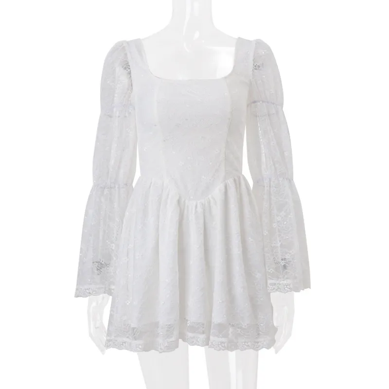 Autumn New Sexy Square-neck Long Sleeve Waist Lace Dress
