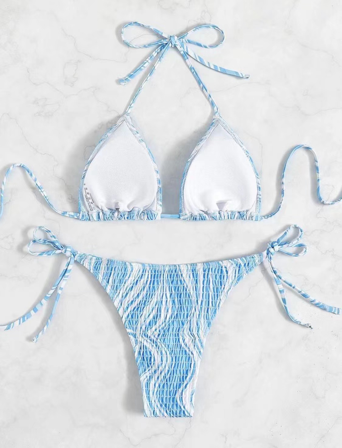 Unleash your inner mermaid with the Azure Wave Bikini Set, the ultimate swimwear for your summer adventures. This two-piece bikini features an enchanting blue and white ripple pattern that mirrors the serene waves of the ocean, creating a visually captivating and refreshing look. The top is designed with adjustable halter neck ties, ensuring a perfect and comfortable fit for every body type. Its ruched texture adds a touch of sophistication and enhances your natural curves, providing both style and support.