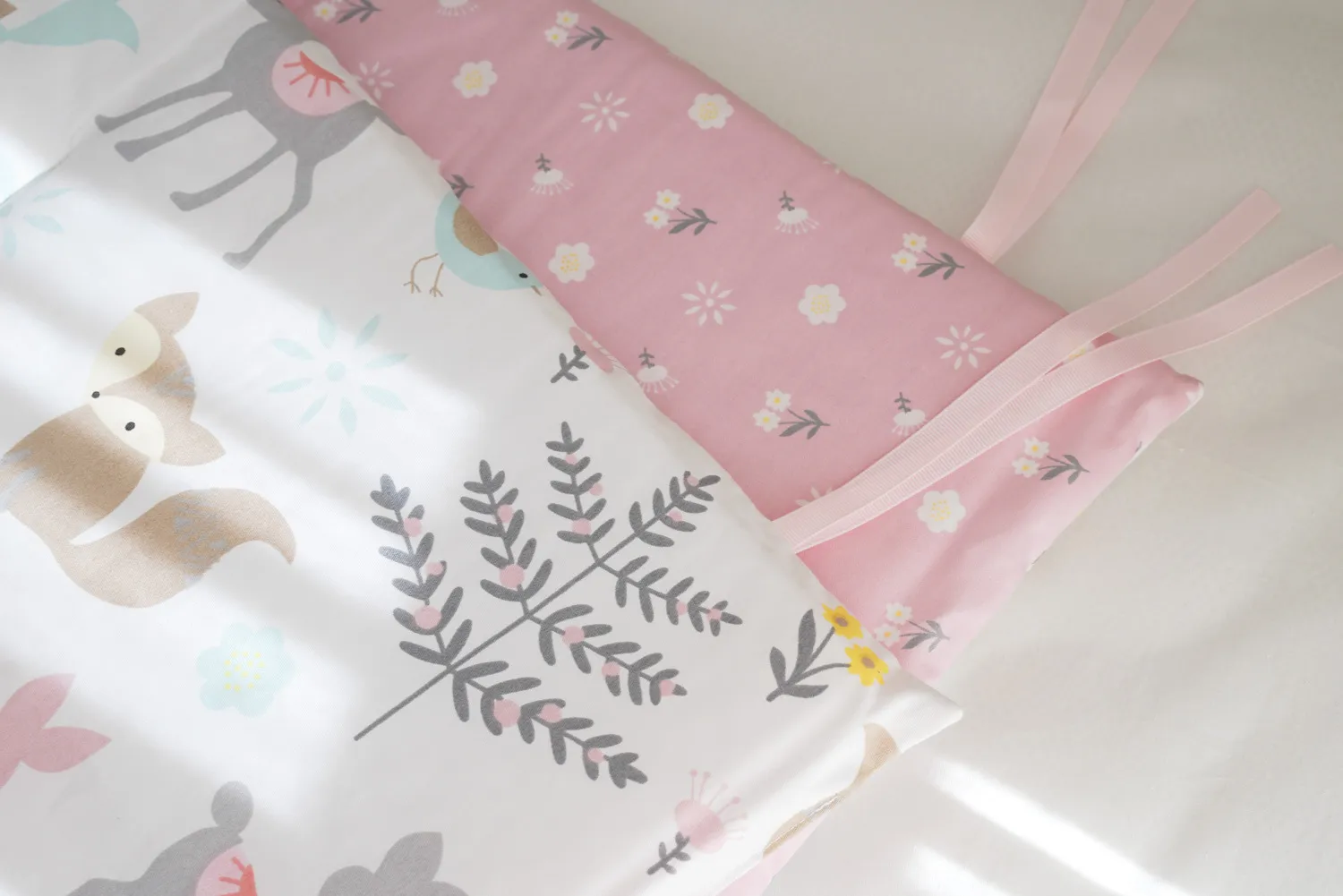 - Functions as a cushioned guardrail for active play on the bed or crib.