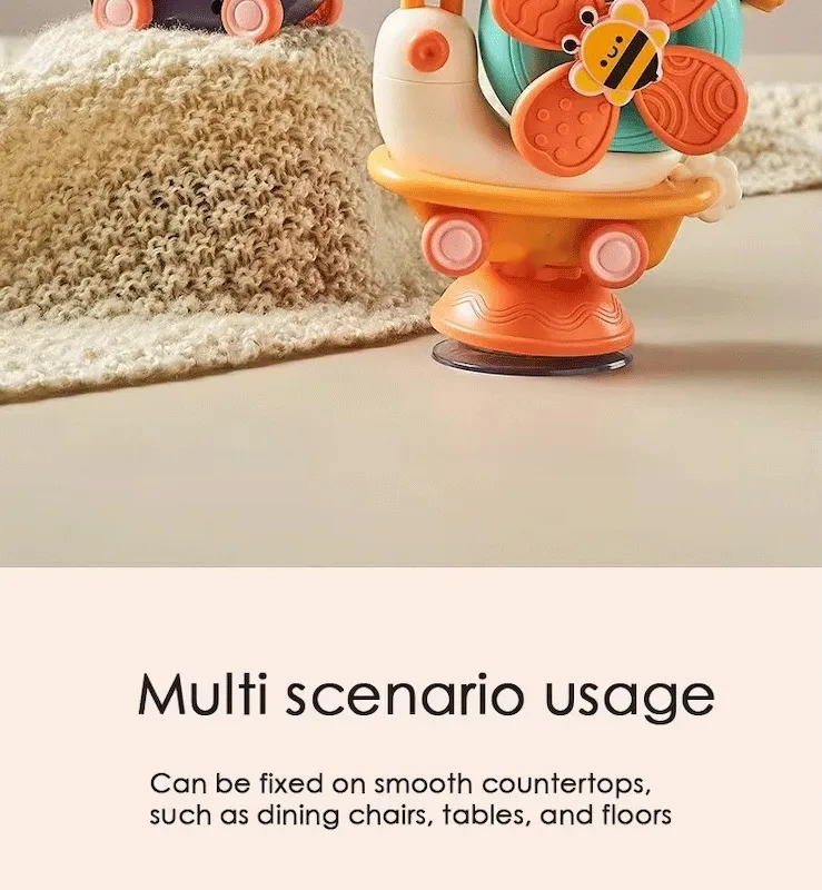 The toy helps babies learn how to entertain themselves during mealtime, promoting independent play. As they interact with the toy, they can explore its rotary features and engage with the colors and movement, which helps keep them occupied while allowing parents to focus on their own tasks.