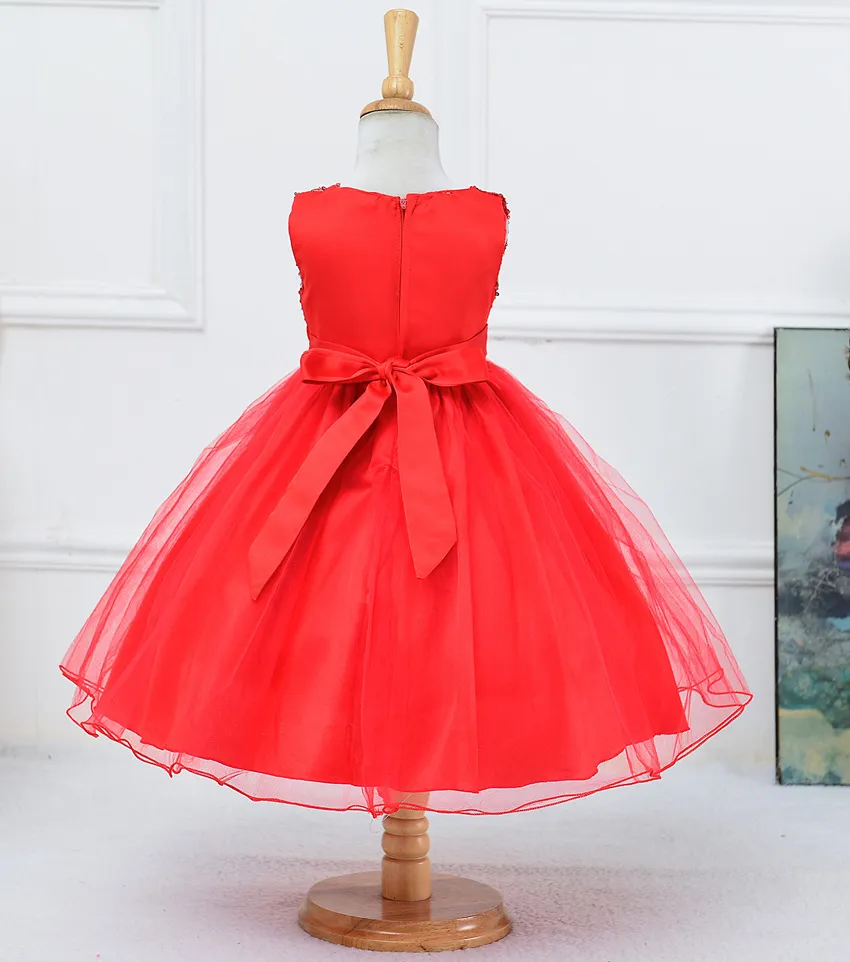 This wedding dress is designed with practicality in mind, featuring a zipper closure at the back for easy dressing and removal. The adjustable waistband ensures a secure fit, allowing your child to move and play freely while still looking picture-perfect. The sleeveless design is ideal for warm-weather events, but the dress can also be paired with a bolero or shawl for cooler temperatures, providing versatility across seasons. The combination of sequins, tulle, and floral detailing gives this dress a timeless appeal, making it suitable for various occasions, from weddings and birthday parties to photo shoots and festive celebrations.