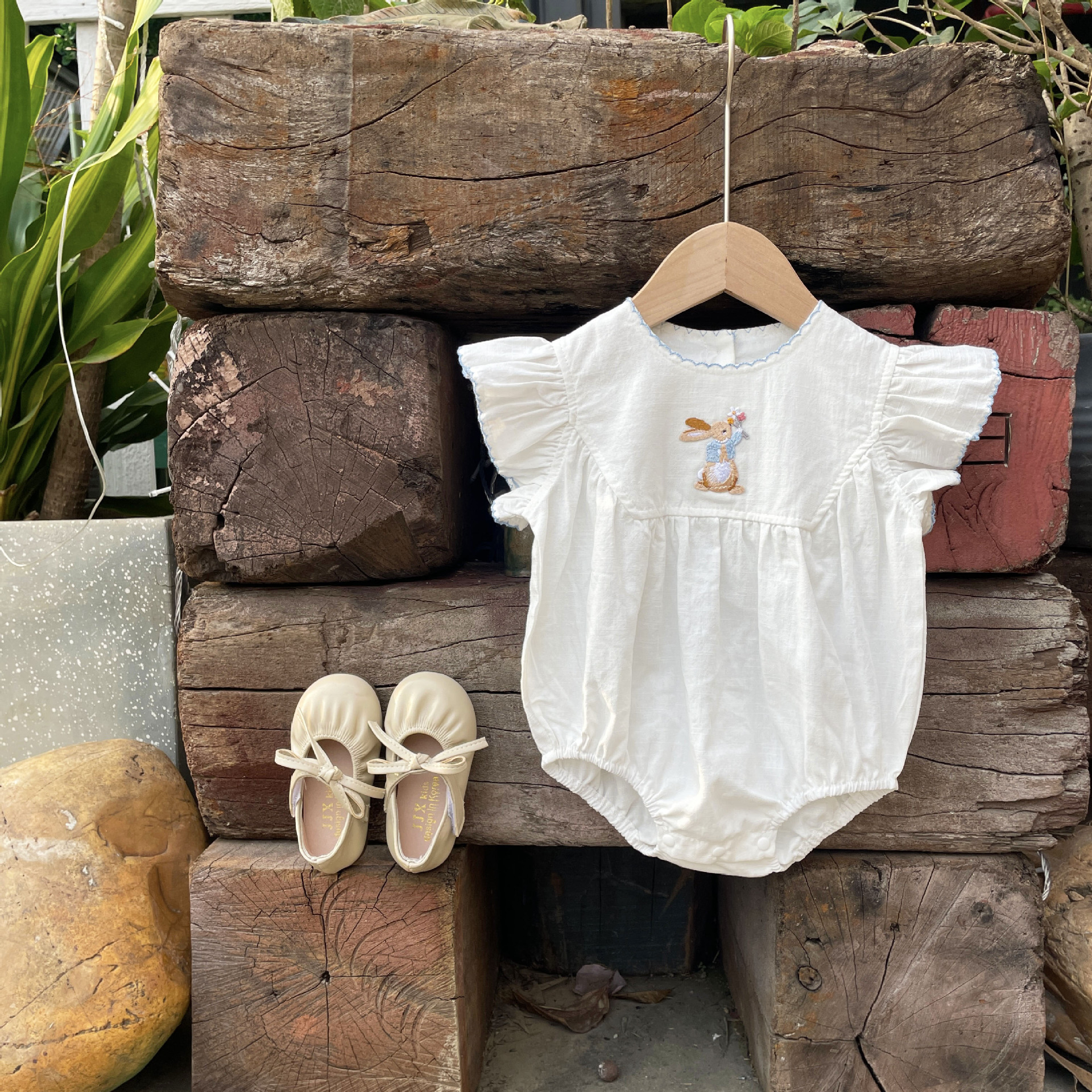 Adorable Bunny Embroidery: The romper is decorated with a cute bunny embroidery, making it a fun and whimsical addition to
