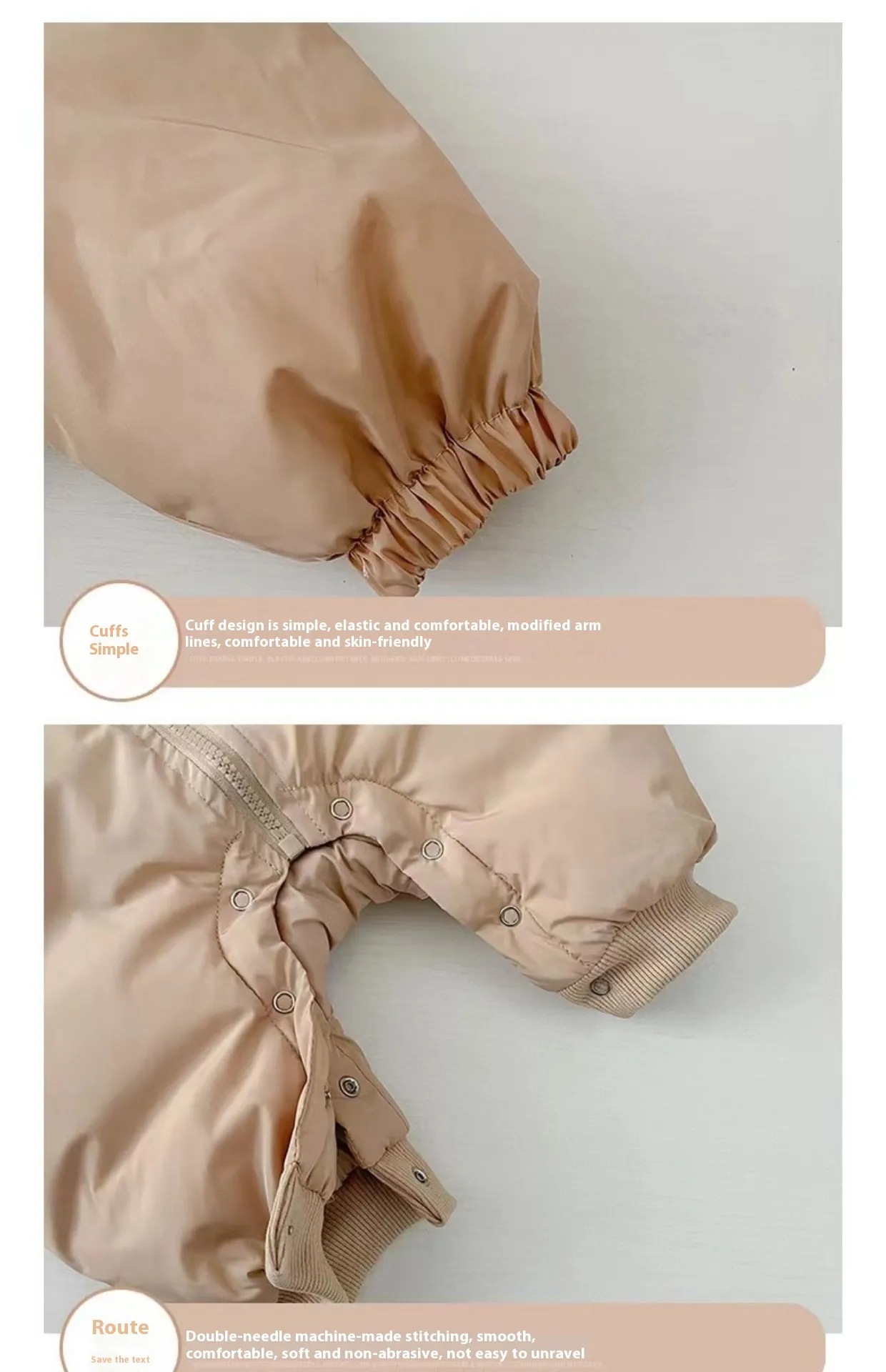 Easy‑use snap buttons, zippers, and elastic cuffs make dressing and diaper changes simple while maintaining warmth.