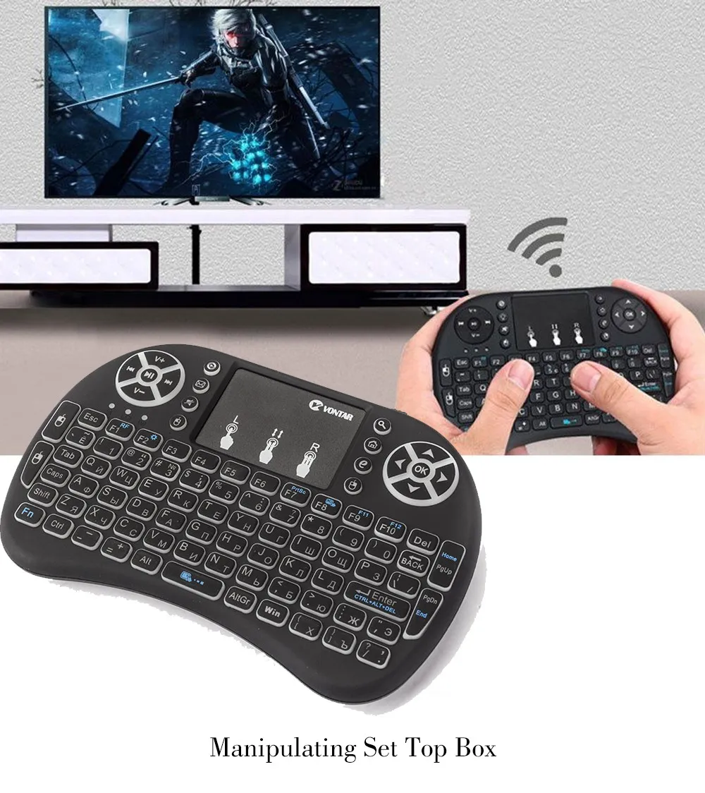 2.4G Mini keyboard with touchpad,LED backlit,multimedia control keys and PC gaming control keys.