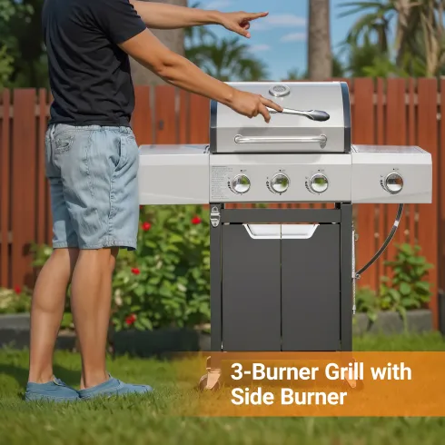 - High-powered Burners: This stainless steel gas grill has 3 main burners (10,500 BTU each) and a side burner (9,000 BTU). 4 burners deliver a total of 40,500 BTU cooking power.