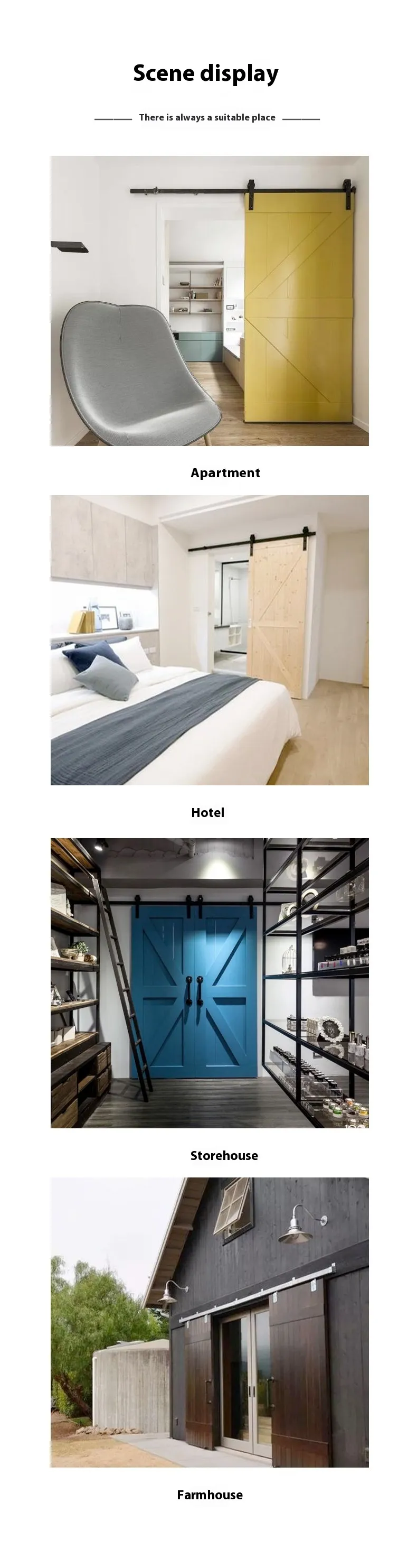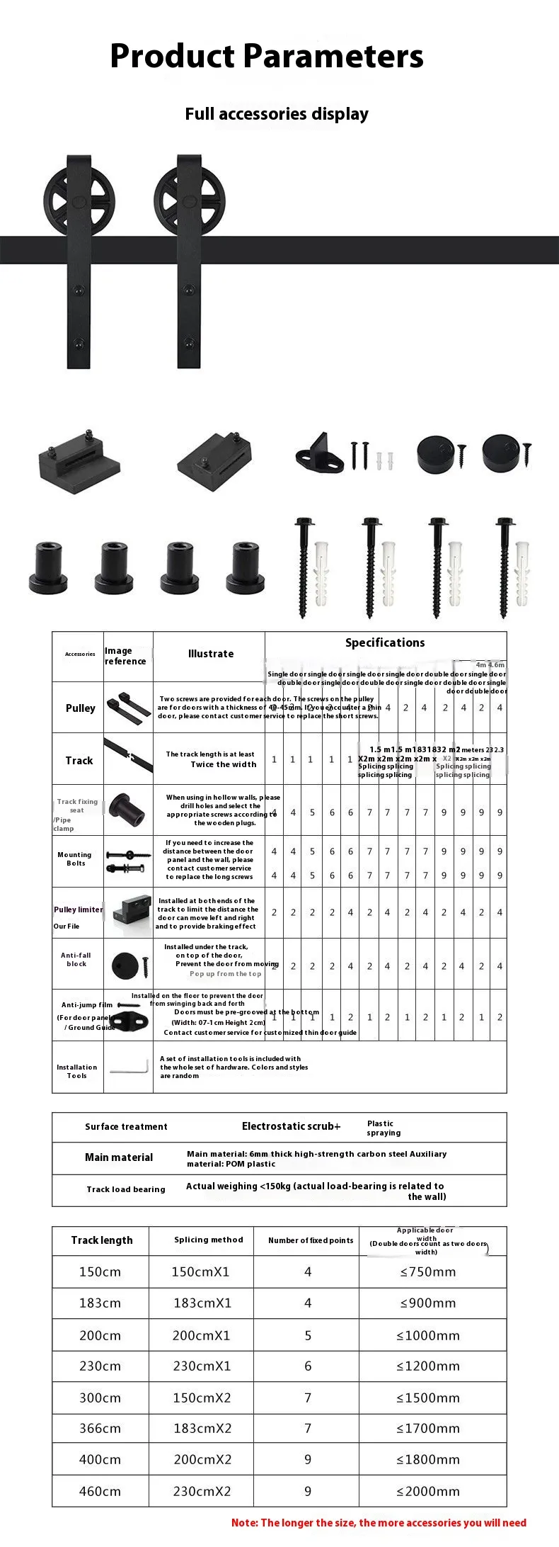 The hardware kit typically includes robust steel rails and precision bearings to allow smooth, quiet door movement. High-quality kits come with adjustable roller heights, anti-jump brackets for safety, and soft-close features that gently pull the door into position at the end of travel.