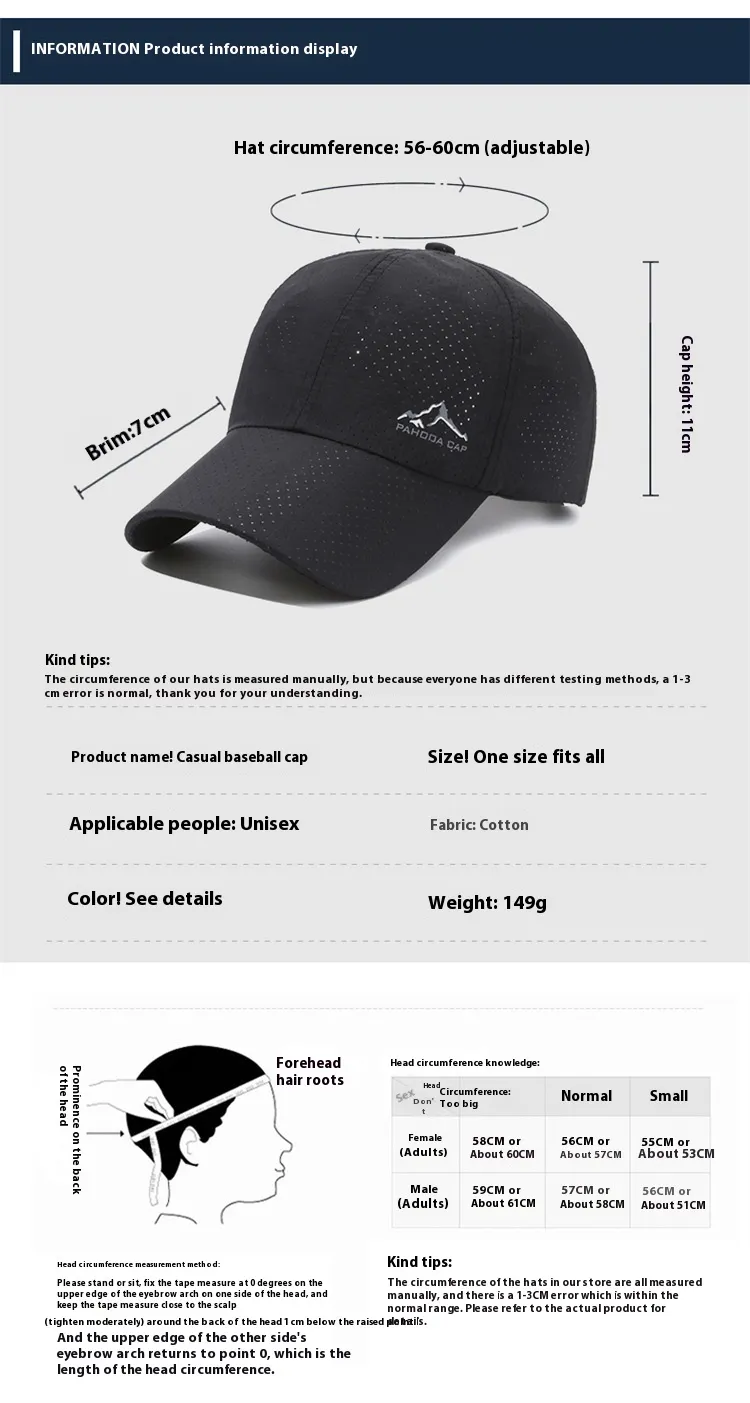 The Baseball Cap Summer Korean Style Men's and Women's Outdoor Simplicity Sun Protection is the perfect combination of style, comfort, and functionality. Designed with a sleek, minimalist aesthetic inspired by Korean fashion trends, this cap offers a simple yet trendy look for both men and women. Ideal for the summer, this cap features excellent sun protection with a classic baseball cap design, ensuring you stay cool and stylish while shielding your face from harmful UV rays during outdoor activities.