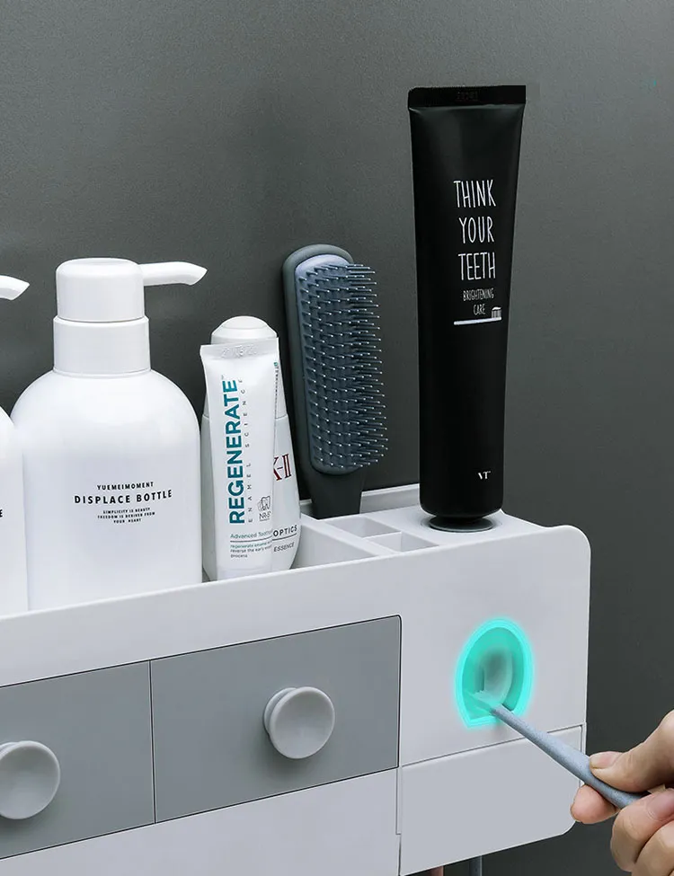toothbrush organizer, bathroom organizer, space-saving bathroom accessory, toothpaste dispenser for family, automatic toothpaste squeezer,