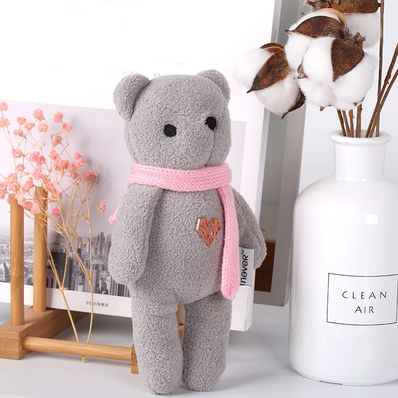 The cute bear doll is soft, plush, and huggable. With a knitted scarf in soft pink, this bear brings warmth and comfort. It’s the perfect cuddle companion, whether placed on a desk, bed, or used as a comforting friend during a break from work or study. The bear’s simplicity and adorable charm make it a perfect gift for those who love soft toys.