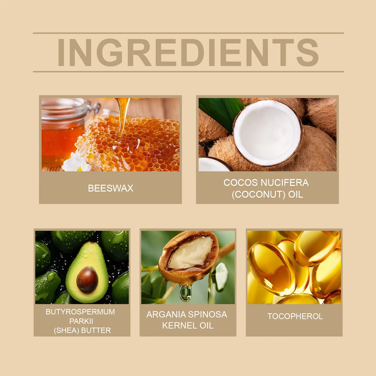 Ingredients: beeswax, coconut oil, shea butter, Morocco nuts oil, vitamin E (tocopherol)