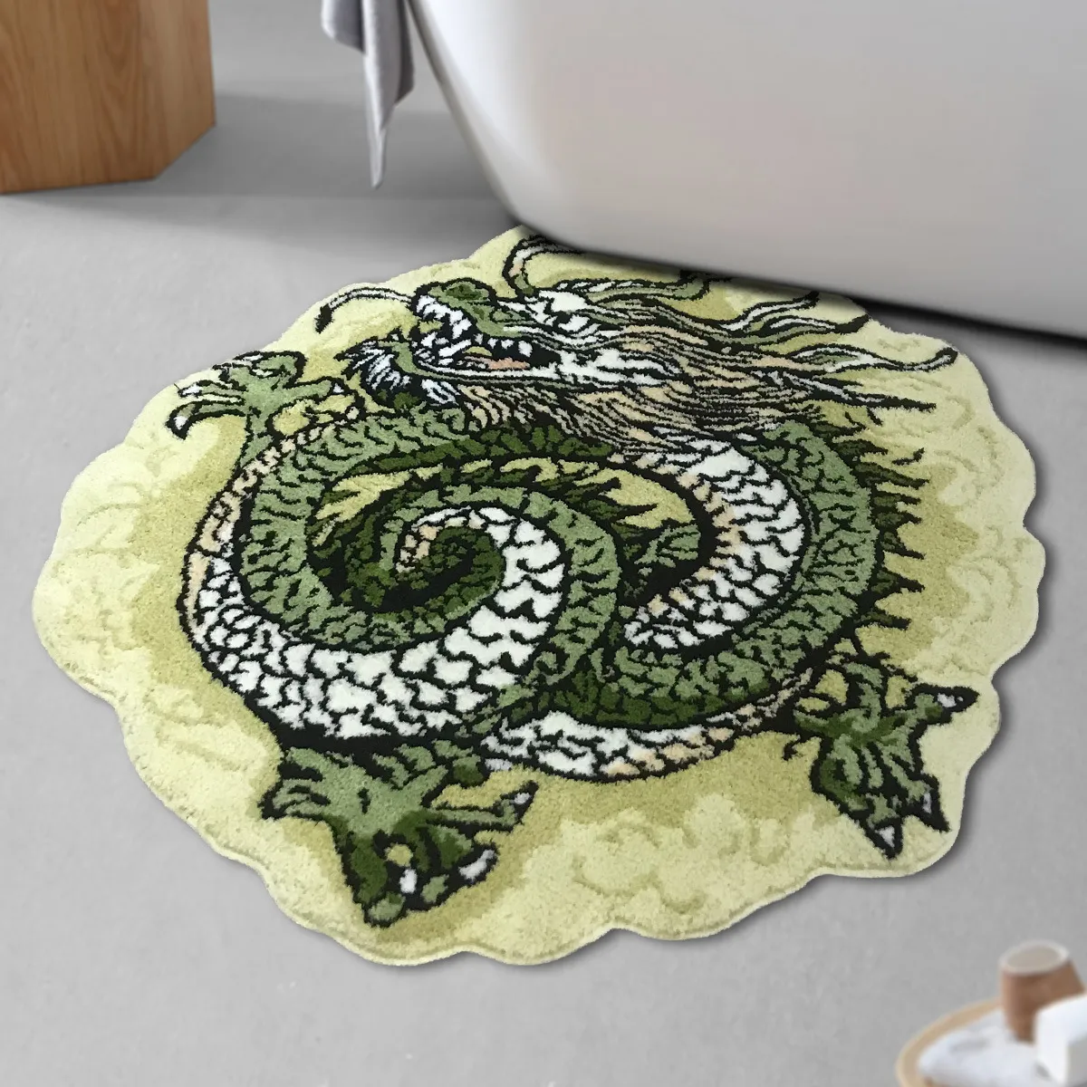 Place this pile floor covering by your bedside to add a touch of comfort and fantasy to your sleeping space. Its dragon design will infuse your room with strength and symbolism while keeping your feet cozy in the morning.