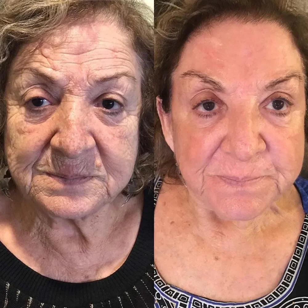 “I have never used a serum that works so well and it is the best value for money out of all my skin care products and it is my favorite product. This photo was taken after 5 weeks of use! Cannot tell the difference from my friends that are 20 years younger. It's like the Fountain of Youth lol! My skin condition has changed a lot. It was recommended by my dermatologist, I love that this serum makes my skin bouncy, wrinkles have sneaked away, my skin has visibly "lifted" and is less oily. I will continue to use it to bring my skin back to a more youthful state."