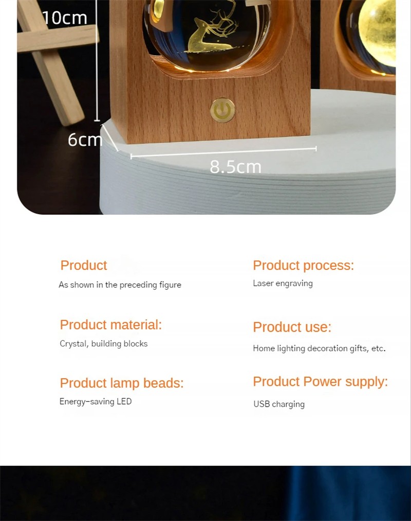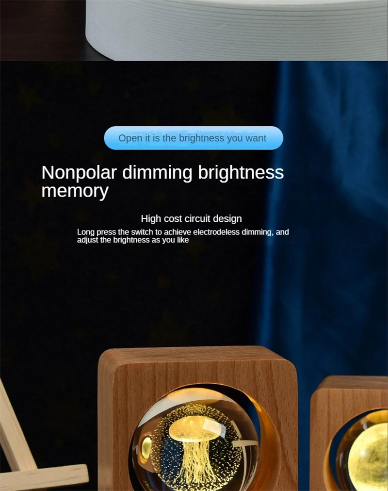 The night light features a high-quality beech wood base that adds a touch of natural elegance to the design. The smooth finish and sturdy construction of the beech wood base ensure durability and stability. The combination of the crystal ball and the wooden base creates a harmonious and stylish look.