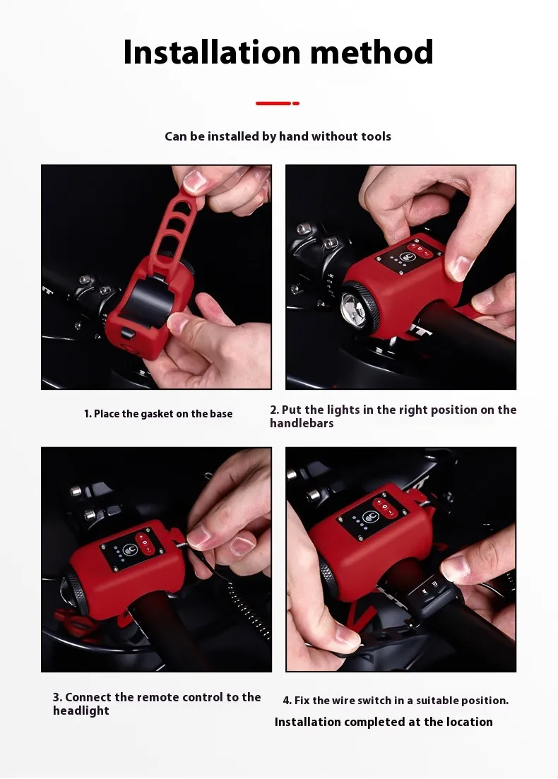 The simple, tool‑free mounting system fits standard handlebars, while easy‑to‑use buttons allow quick activation of the horn and floodlight without compromising rider focus.