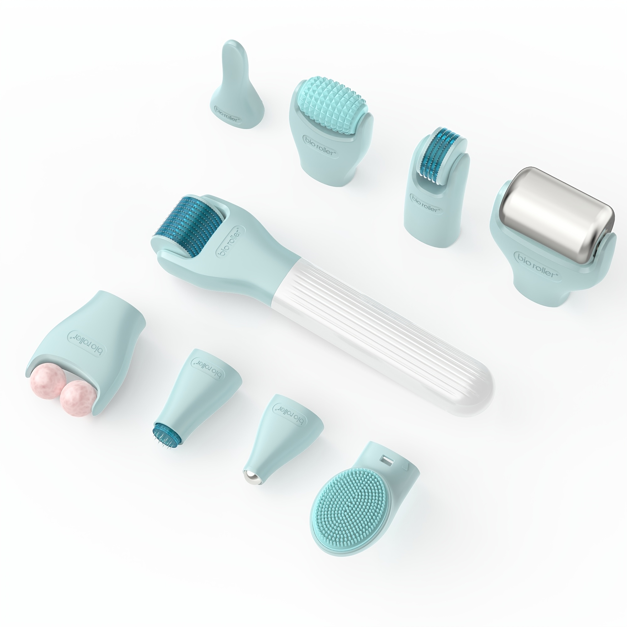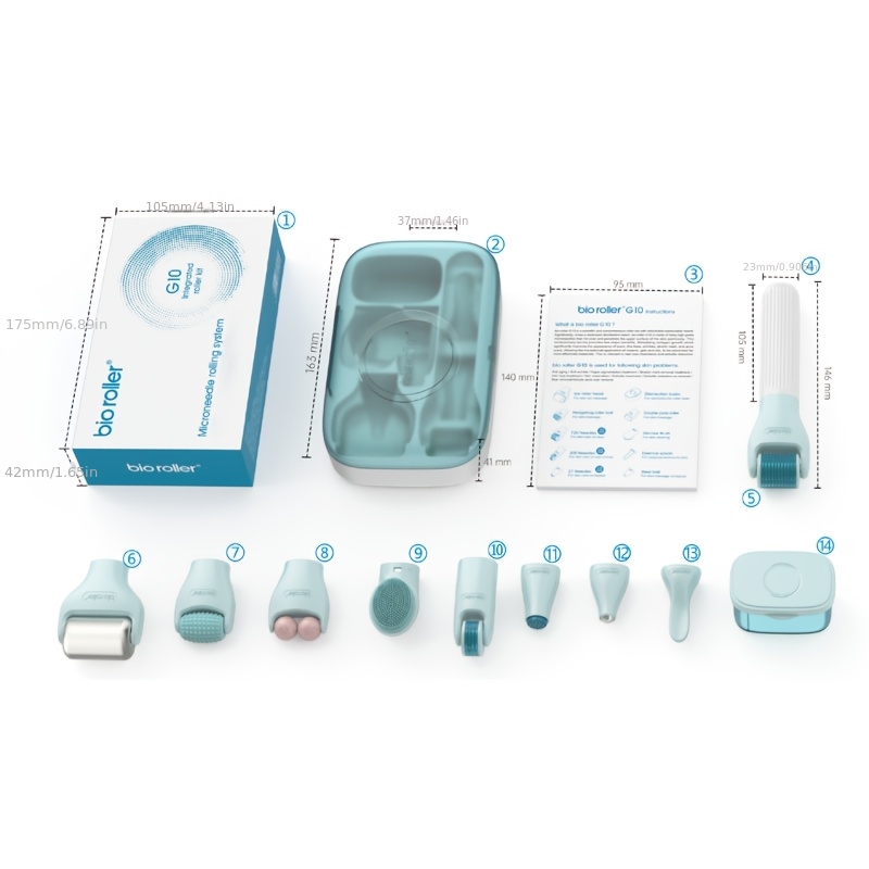 The Bio Roller G10 is a complete microneedle rolling system that includes multiple roller attachments and accessories designed for different areas of the face and body.