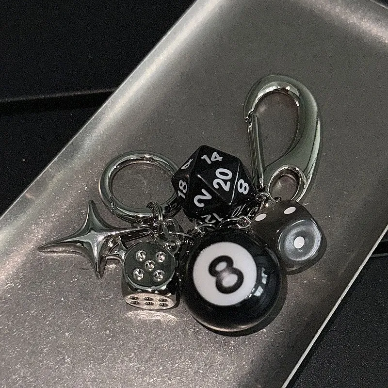 Inspired by the classic 8-ball dice, this keychain pendant combines street style, gaming culture, and minimalist fashion into one chic accessory.