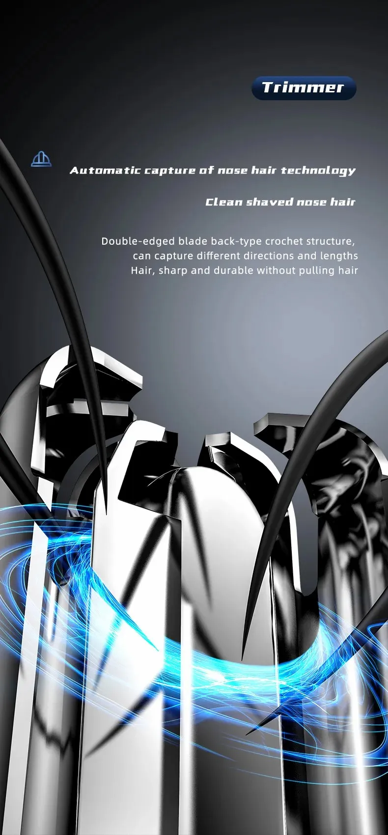 - Trim Hair: Gently insert the trimmer into your nostrils or ears and move it in small circular motions. The cutting blades will quickly and safely remove the unwanted hair.