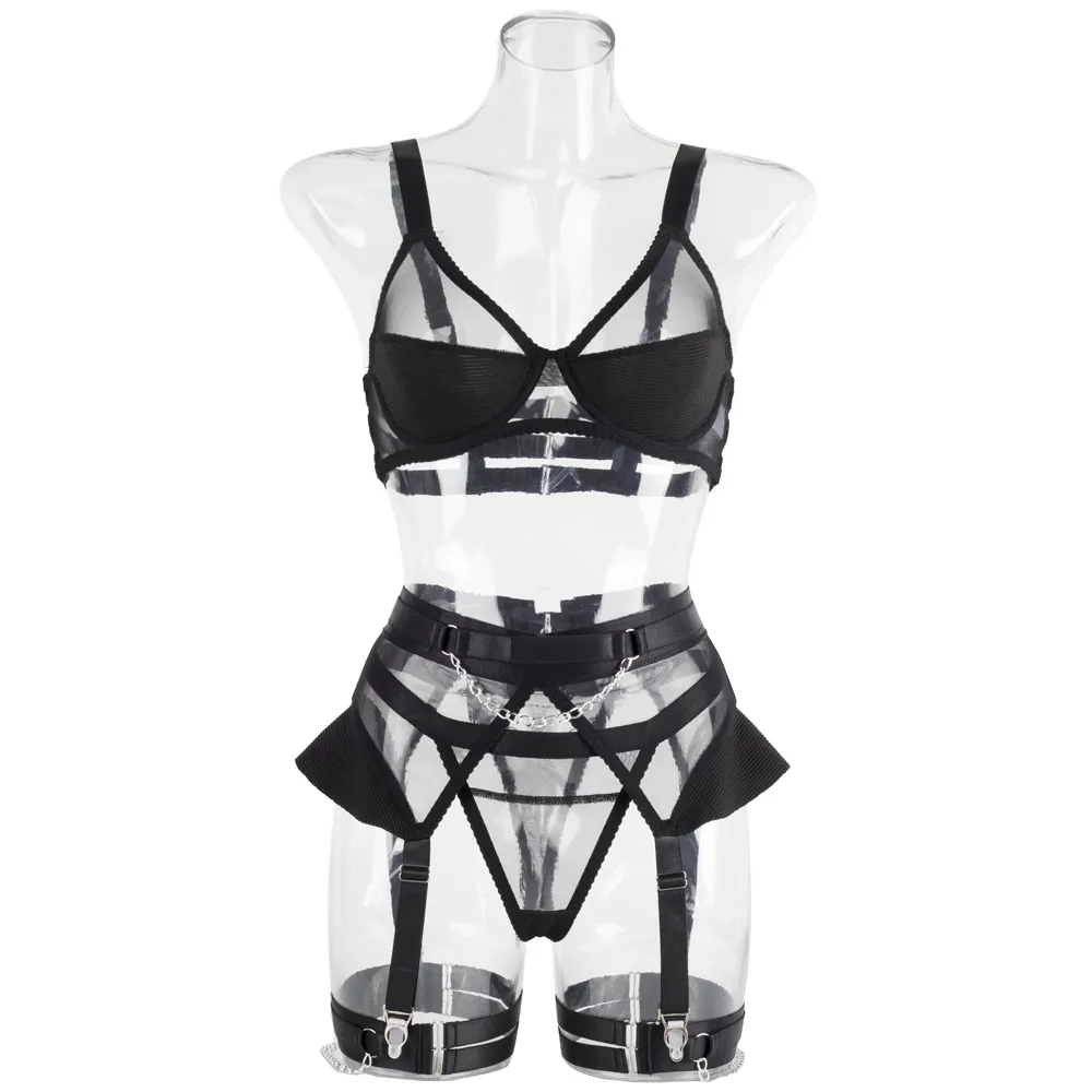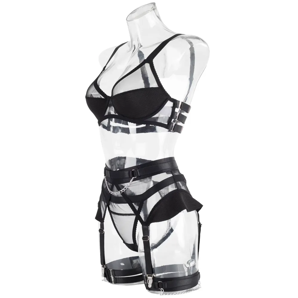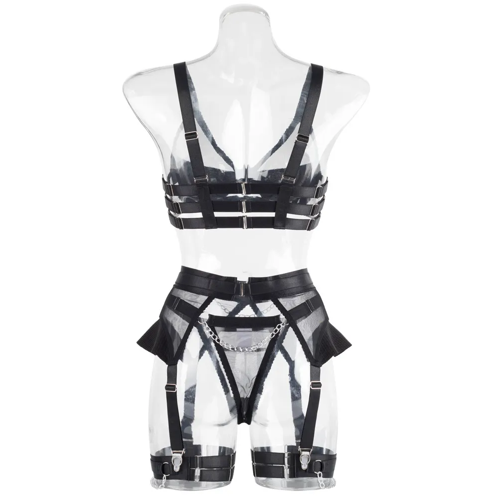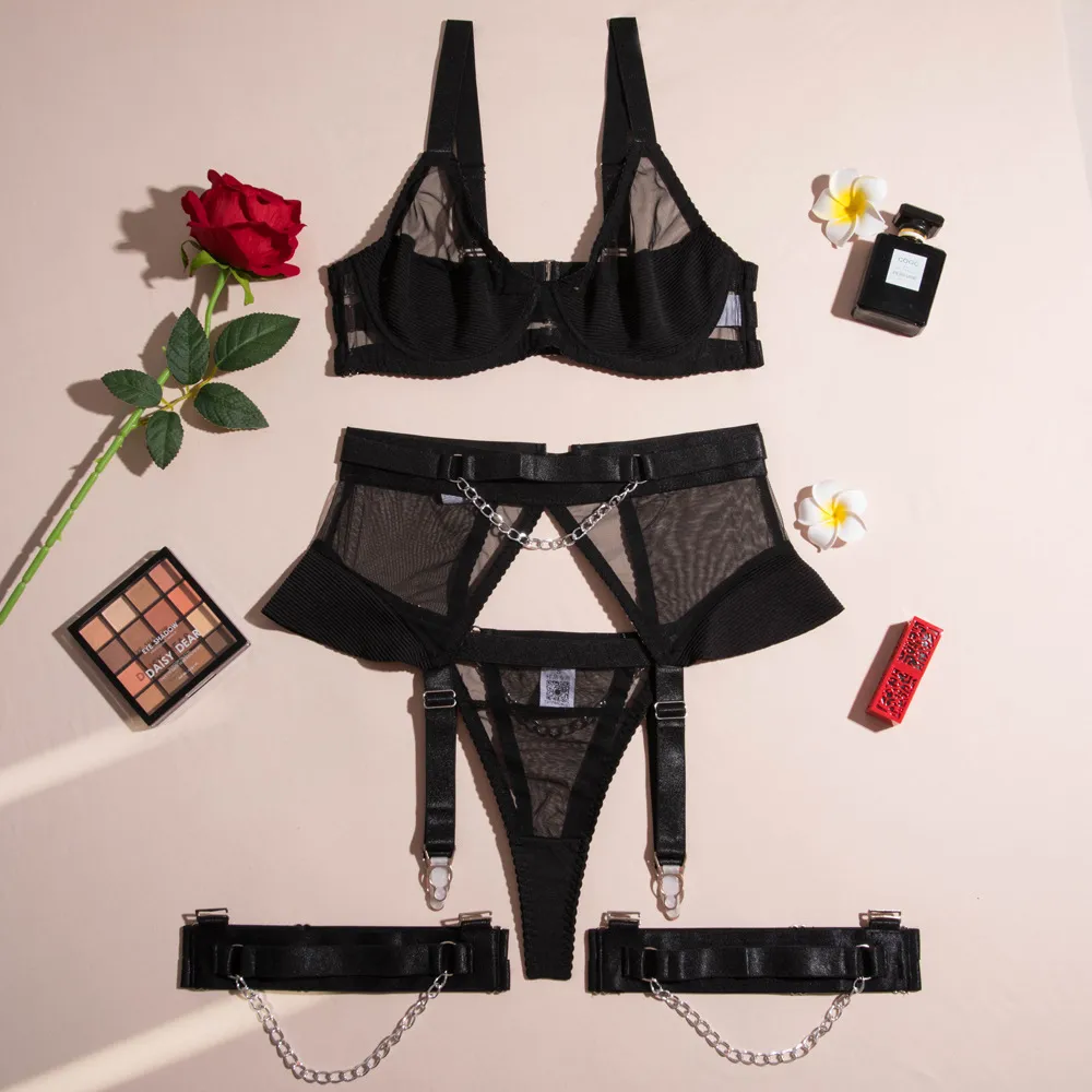 Black Steel Ring Mesh See-through Chain Underwear 4 PCs Set