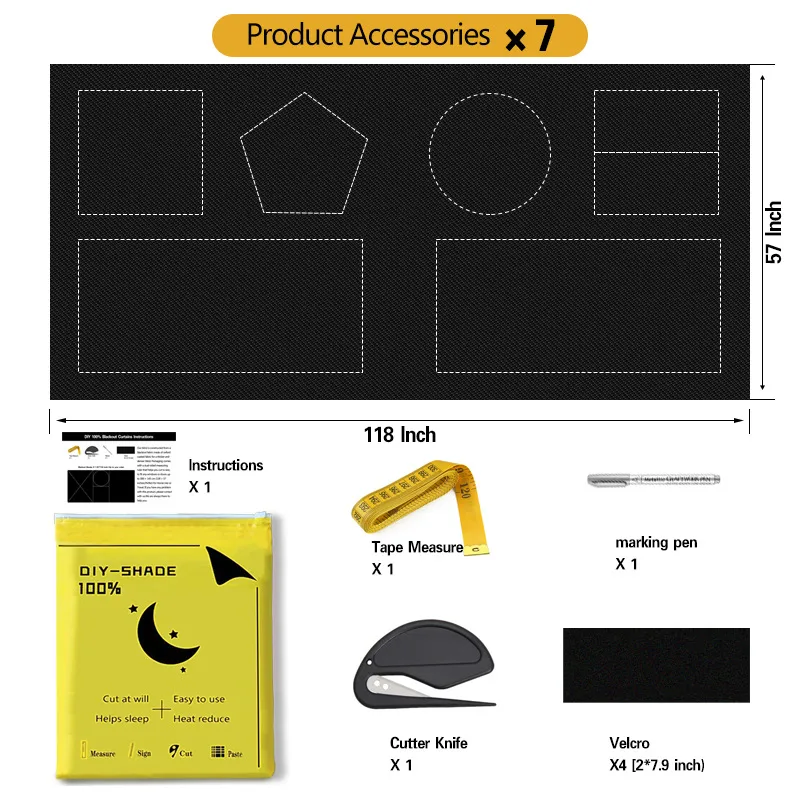 1*Curtain+Including pen, ruler, fabric cutter, adhesive Velcro, full blackout cloth, English instruction manual, packaging bag