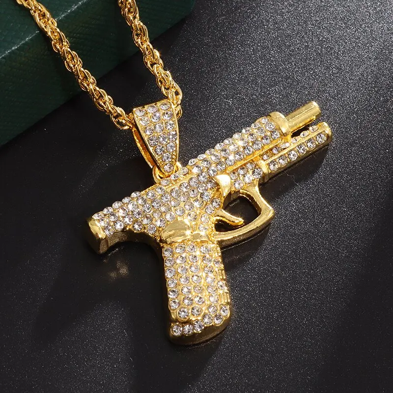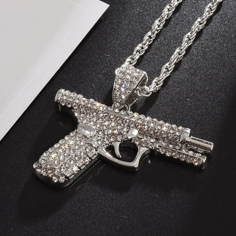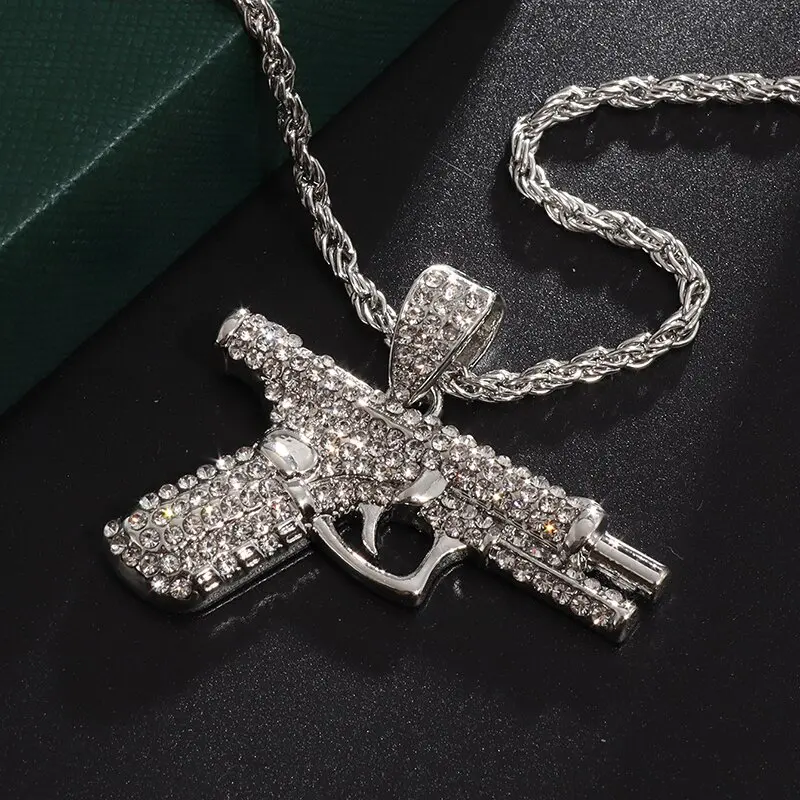 Another cornerstone of this necklace’s design is its capacity to appeal across multiple subcultures. Rock and punk enthusiasts often favor statement pieces that exude rebellion—spiked collars, studded jackets, or band patches are staples in these circles. A pistol or submachine gun pendant resonates with that rebellious streak, representing anti-establishment attitudes and a willingness to challenge norms. However, the addition of bling softens the aggression, injecting a layer of showmanship and extravagance that can integrate well into edgy outfits. If your personal style merges these influences—let’s say you love the grit of punk and the sparkle of hip hop—this necklace might become a go-to accessory that bridges both worlds.