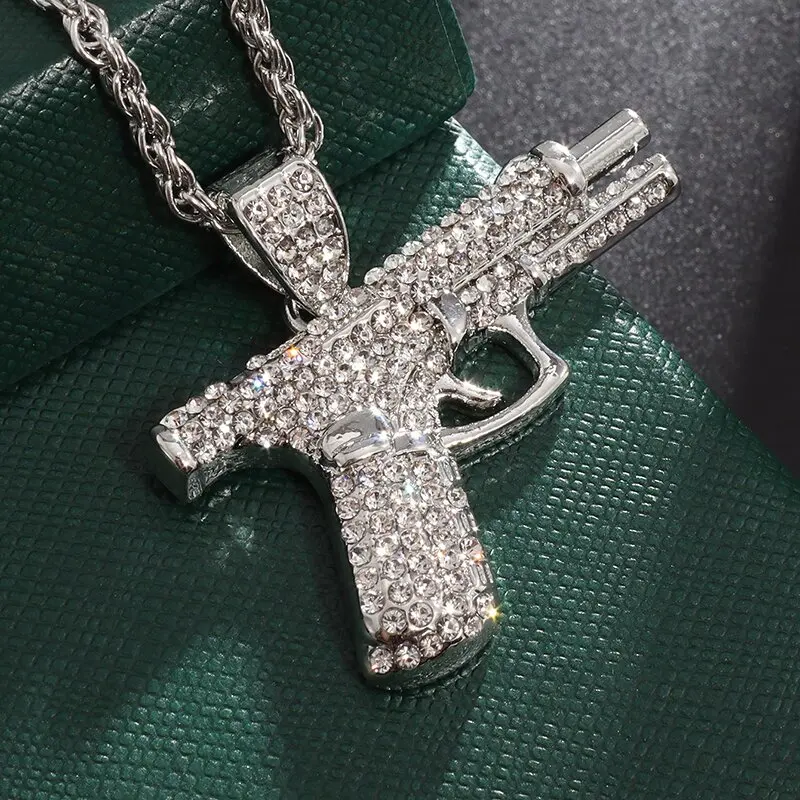 At the core of its appeal is the “iced out” effect. This term typically describes jewelry covered in rhinestones, cubic zirconias, or other crystals that shimmer under the light—an aesthetic popularized by hip hop culture. For decades, artists, producers, and fans of the scene have adorned themselves with iced-out accessories as symbols of success, self-expression, and flamboyance. Translating that concept onto a submachine gun pendant merges the grit of street style with the grandeur of heavy sparkle. Depending on the lighting, each stone can reflect a spectrum of colors, ensuring that your piece pops whether you’re under neon club lights, a bright festival stage, or casual daylight. If you identify with rap, trap, or R&B vibes, the necklace instantly ties your look to the flamboyant spirit that has become synonymous with these genres.