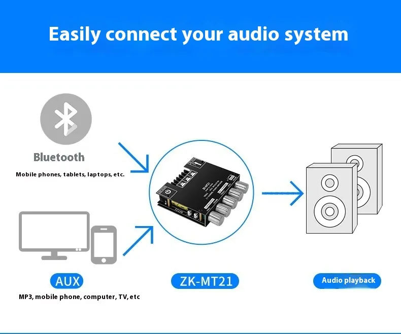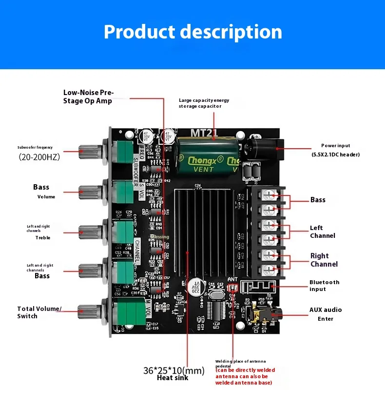 The Bluetooth Amplifier is a device that combines amplification power with wireless Bluetooth connectivity, enabling you to stream music or audio from smartphones, tablets, or other Bluetooth-enabled devices directly to your speakers. The amplifier boosts the sound output, providing clearer, more powerful audio with improved depth and richness. Whether you're listening to music, podcasts, or playing audio from videos, this amplifier enhances your sound system with high-quality performance.