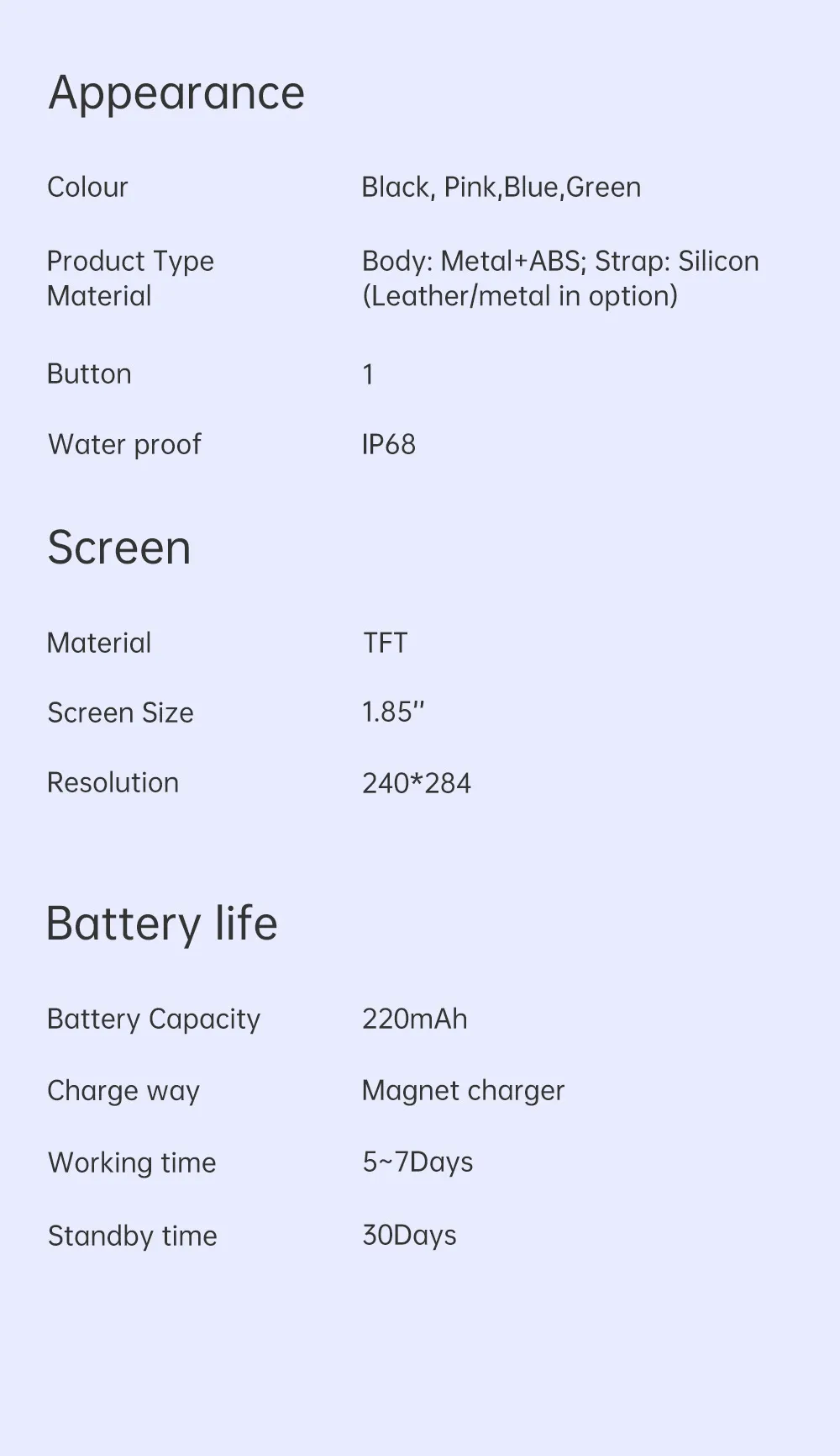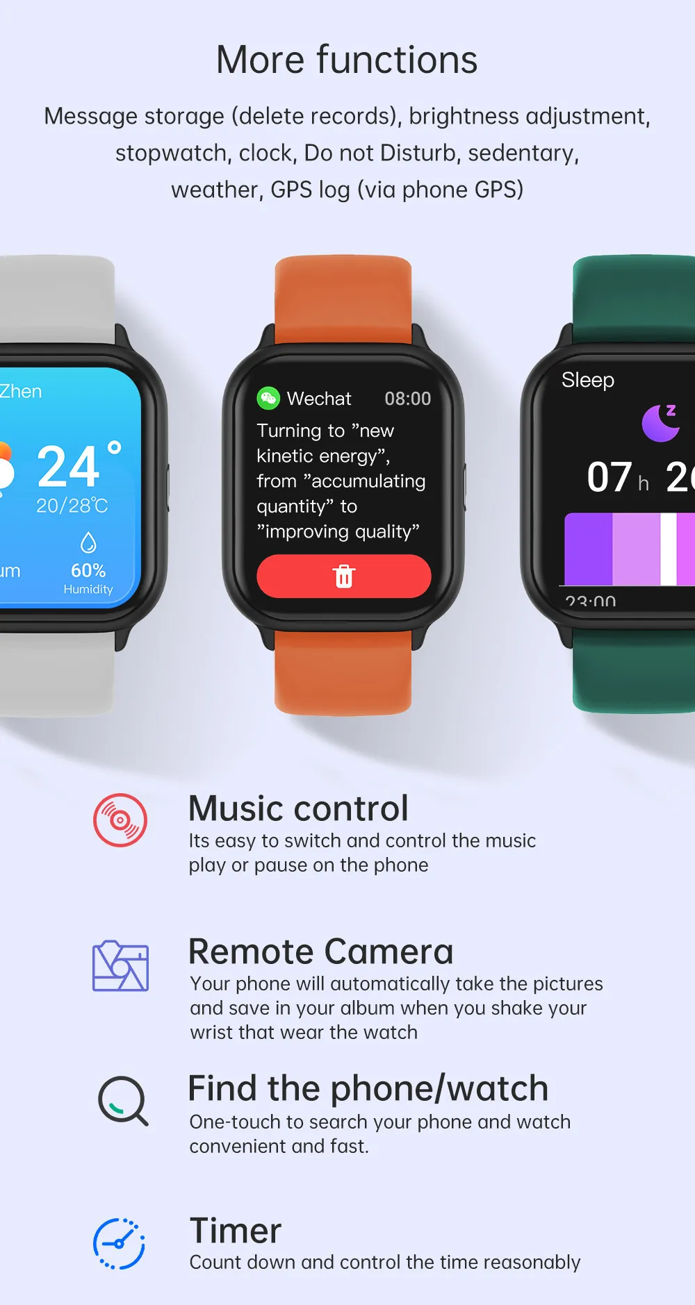 Function: Bluetooth calling, smart reminder, remote control selfie, sleep monitoring, blood oxygen detection