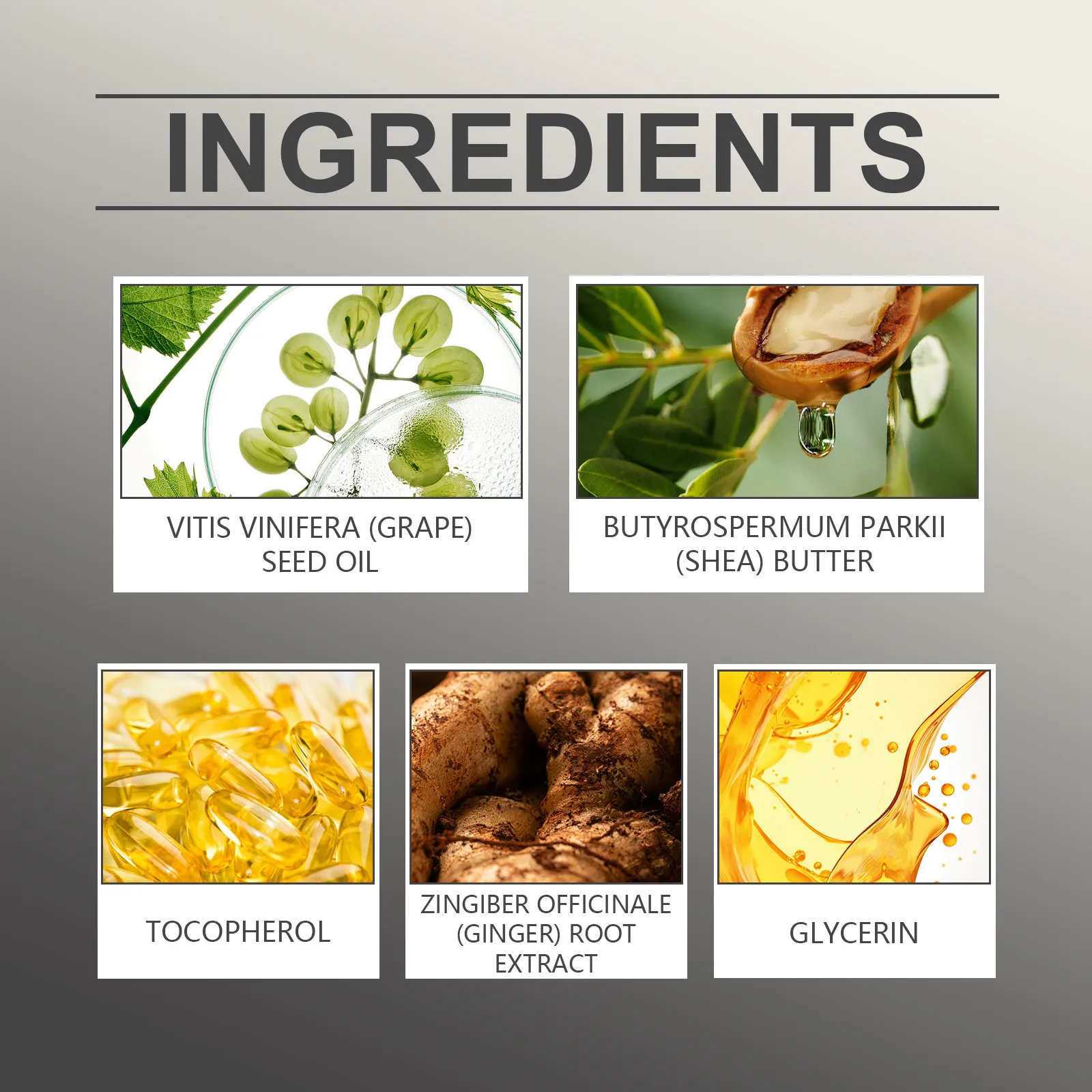Ingredients: glycerin, grape seed oil, shea butter, tocopherol (vitamin E), ginger root extract