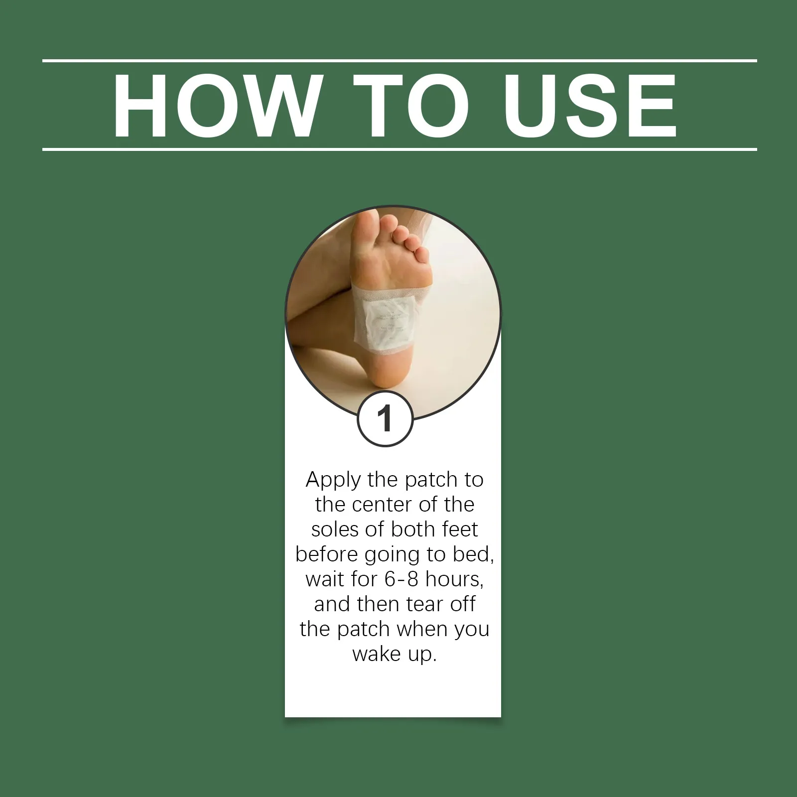 - Peel and Place: Remove the adhesive backing and position the patch on the sole of your foot, ensuring the detoxifying ingredients face your skin.