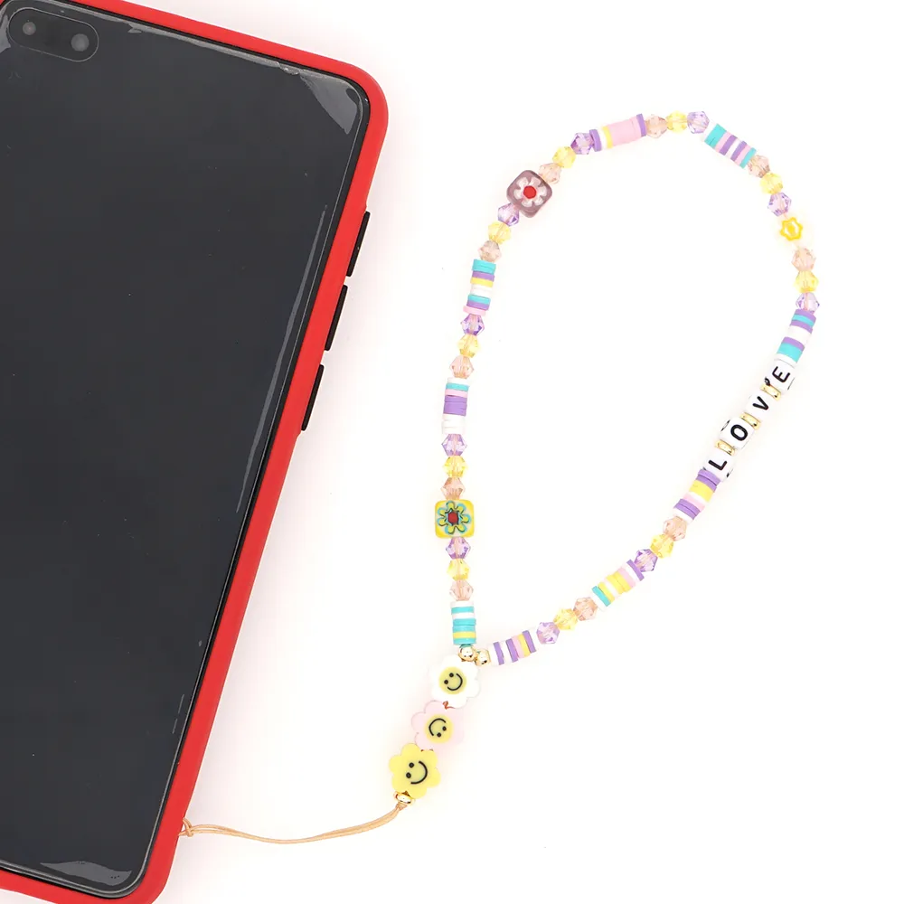 Bohemian Smiley Soft Ceramic Phone Chain Love Letter Crystal Beads Handmade Beaded Anti-Lost Mobile Phone Lanyard