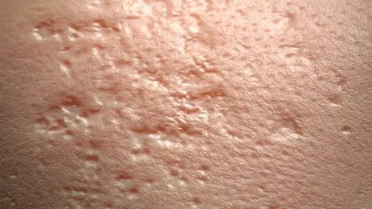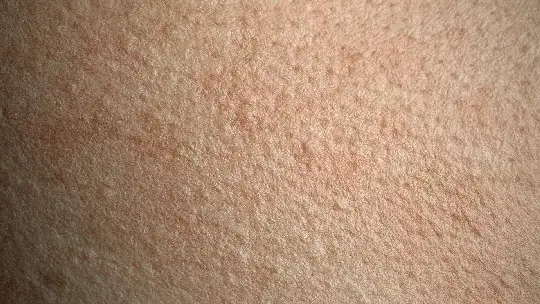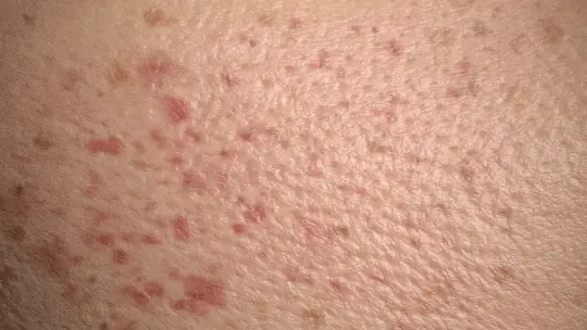 separate and break free from a single spot on skin. Dark red or purplish marks (post-inflammatory erythema) are visible blood vessels close