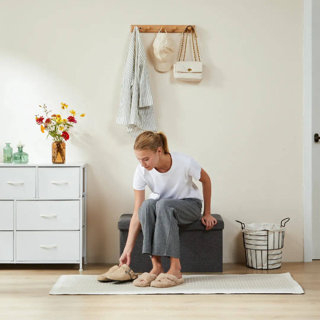 - 【Easy Set Up】Unfold, insert the bottom panel, connect the feet, and your folding storage bench is set for use.