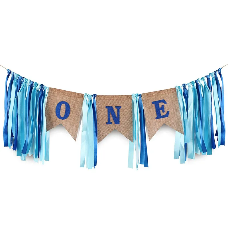 Complete Party Decoration Set: Includes a blue "ONE" table runner, a birthday hat, and a cake accessory, offering a