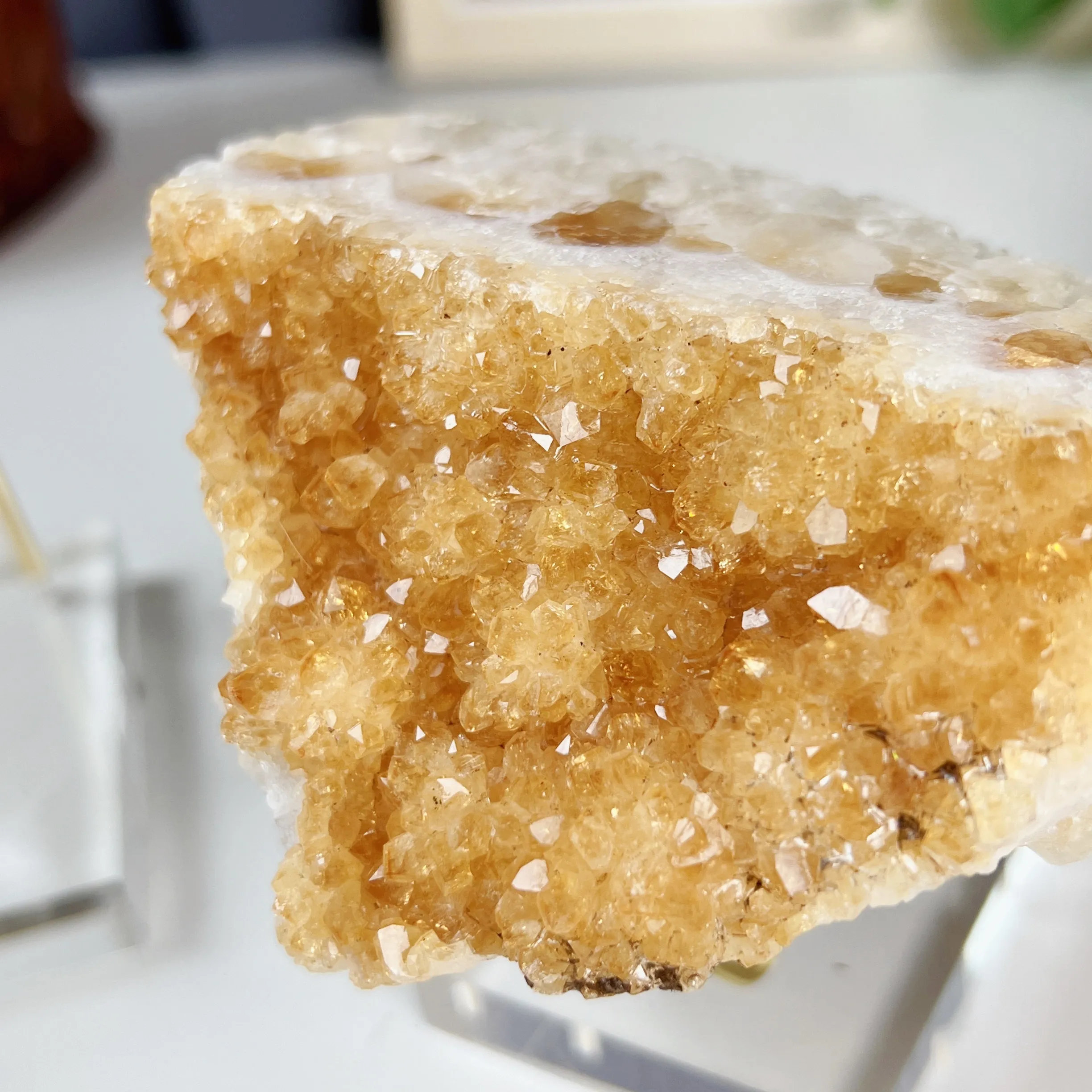 living space with a touch of natural beauty. This crystal cluster features multiple vibrant citrine crystals that are known for their warm,