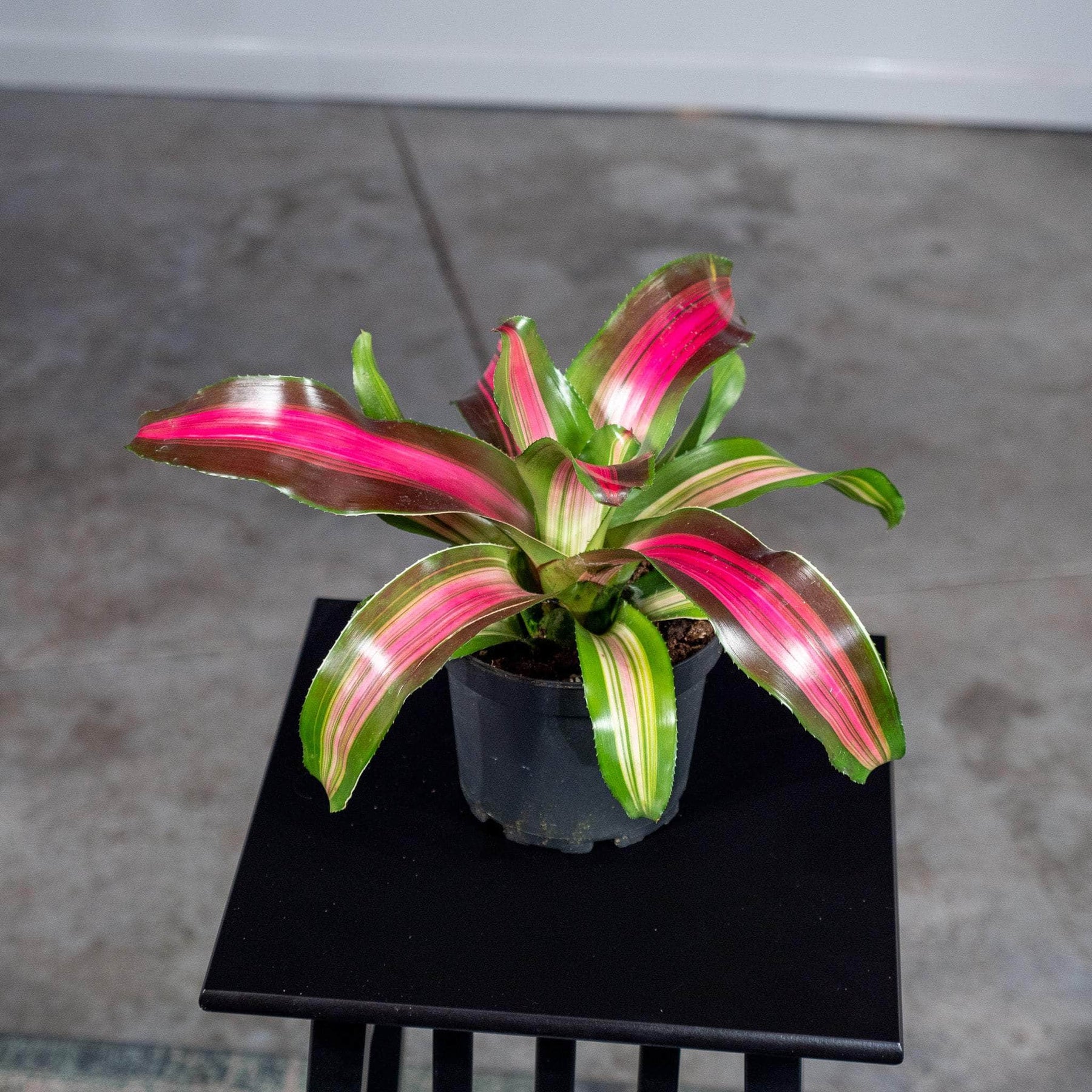 Neoregelia 'Wolfgang' features a rosette of broad, arching leaves that display an extraordinary blend of colors. The leaves are a lush green with vivid, bright pink and red central stripes that radiate outward, creating a dazzling visual contrast. The edges of the leaves are often tinged with a soft, reddish hue, adding to the plant's overall allure. This Bromeliad's compact and symmetrical growth habit makes it an ideal centerpiece or accent plant in any setting.