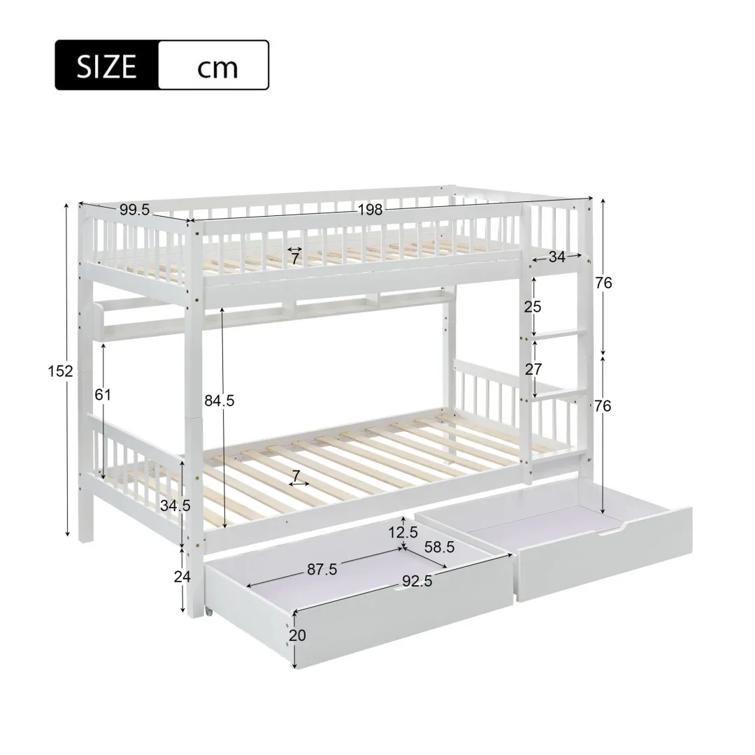bunk bed NZ, kids single bunk bed white, 3ft bunk bed storage, solid pine bunk bed kids, under-bed drawers bunk bed New Zealand, childrens