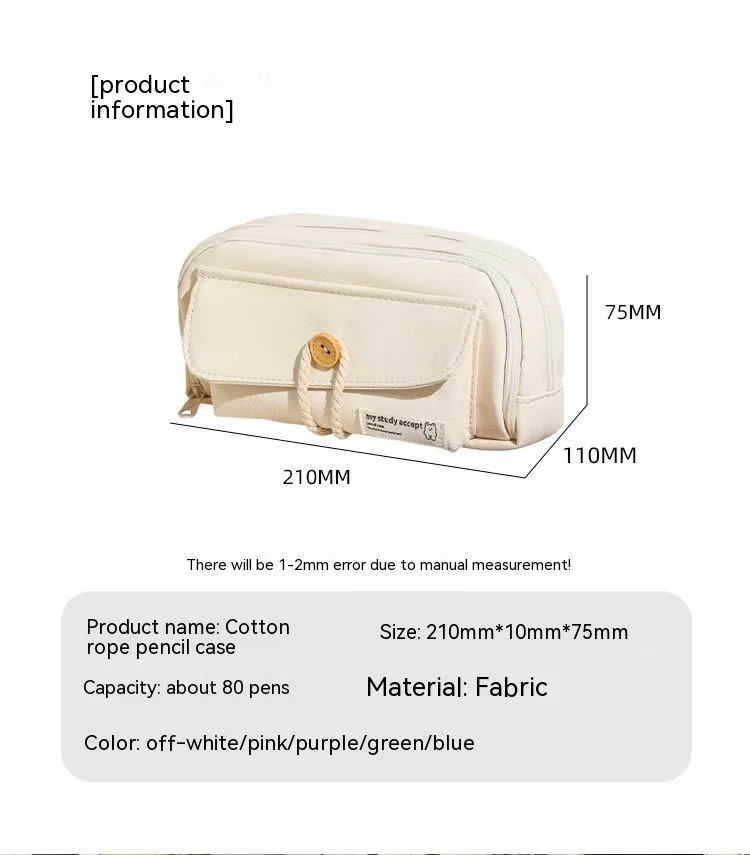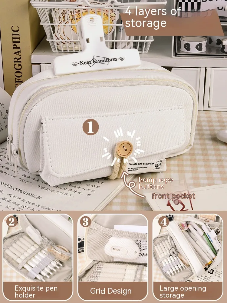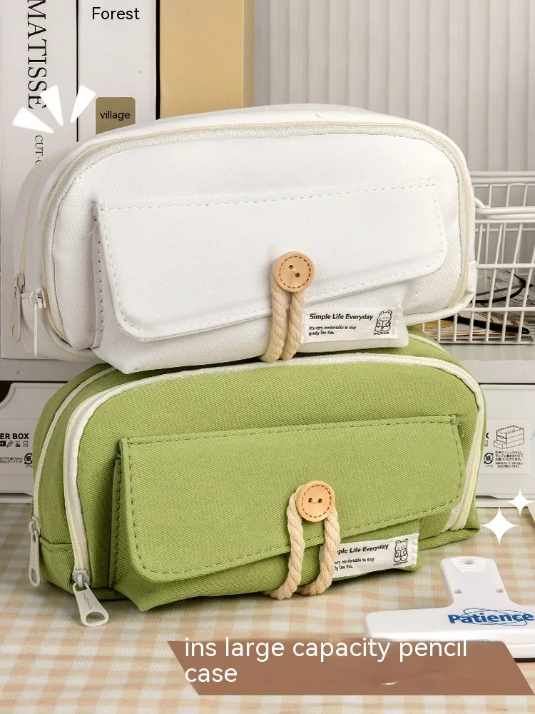 Button Pencil Case Girls Large Capacity Simple Student Creativity Canvas Stationery Bag