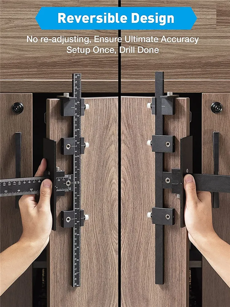 The jig is designed for intuitive setup. Once adjusted to the required spacing, it can be reused repeatedly across multiple doors and drawers, significantly reducing installation time. This repeatability is especially valuable for kitchens and large cabinetry projects where consistency is critical for a professional finish.