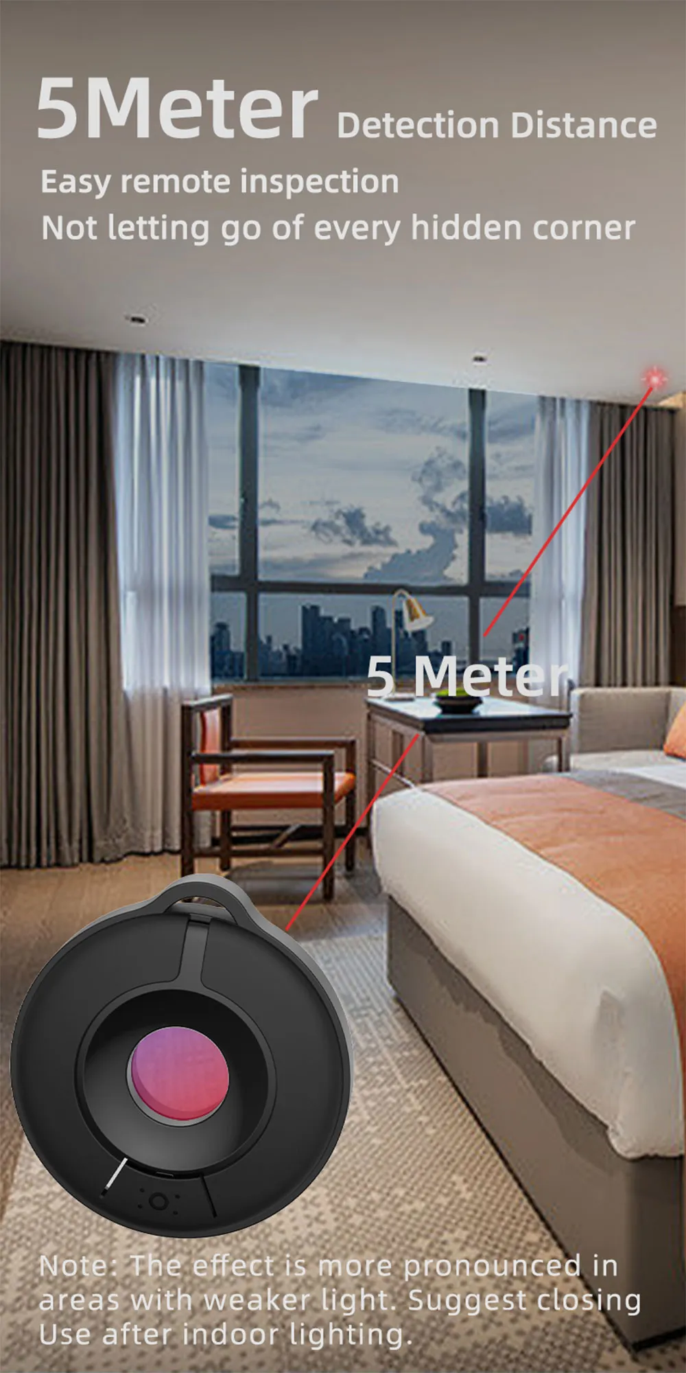• Nowhere to Hide :Designed with versatility in mind, this detector is capable of detecting cameras in areas where hiding is impossible,