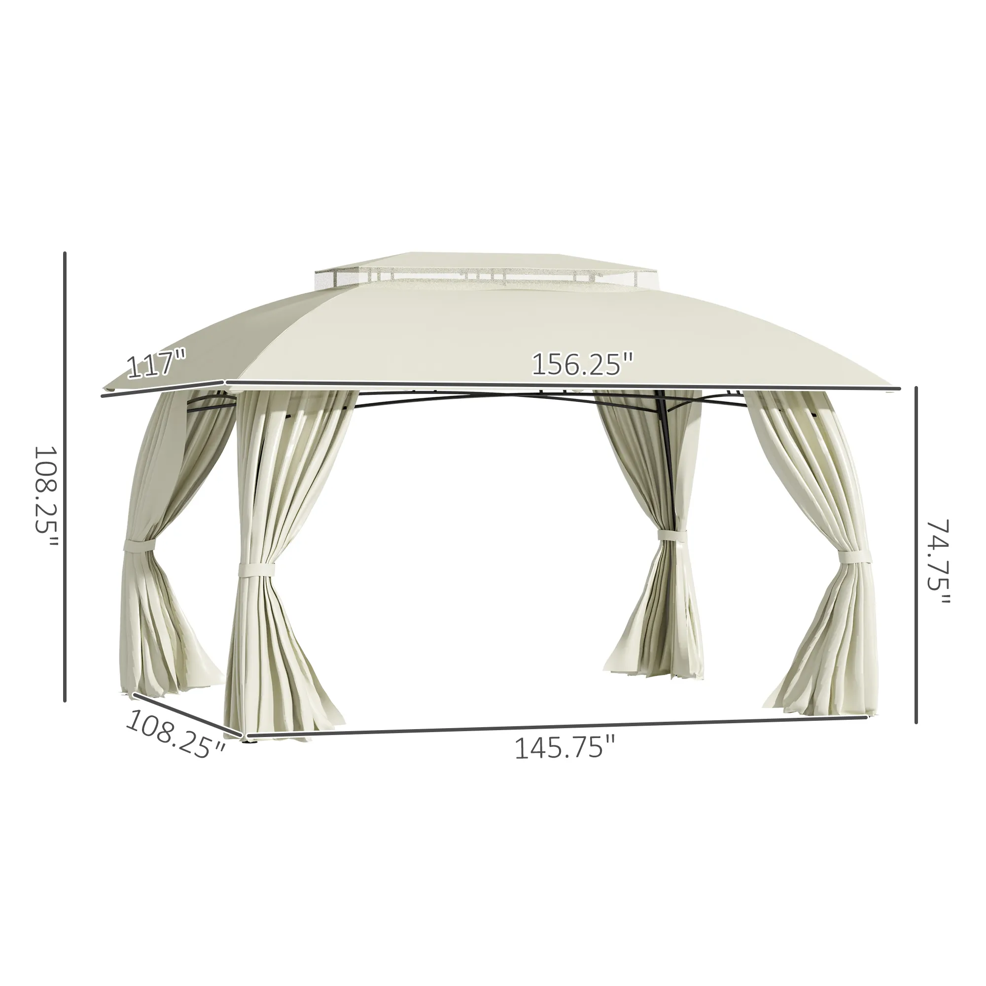 Description:Our canopy gazebo features a rounded 2-tier roof to stop sunburns and keep you cool. Made of fade-protected PA-coated polyester and strong steel, our gazebo canopy holds up to weathering and is ready for repeat use. Keep guests comfortable in the shade with an extra-large floor plan. With curtains closed, it can keep out wind, glare, and winged annoyances. The vent provides a pleasant breeze when you use the sidewalls. So, plan a picnic and prepare a barbeque, get out, get comfy, get Outsunny. Features: - Spacious yet elegant design - 2-tier vented rooftop to enjoy the breeze and better endure the wind - PA-coated polyester protects it and you from UV - Easy hook and loop sidewall curtains keep out wind, glare, and winged annoyances - Steel frame for stronger support - Eight support stakes for mounting it to soft ground - Assembly required Specification: - Color: Beige - Materials: Steel, Polyester - Overall Dimensions: 13' L x 9.7' W x 9' H - Eaves Height: 6.2' H - Column Spacing: 12.1' L x 9' W - Item Label: 84C-326CW - Please do not use it during floods, extreme wind, or snow Package Includes: - 1 x Gazebo - 8 x Ground Stake - 1 x Manual.