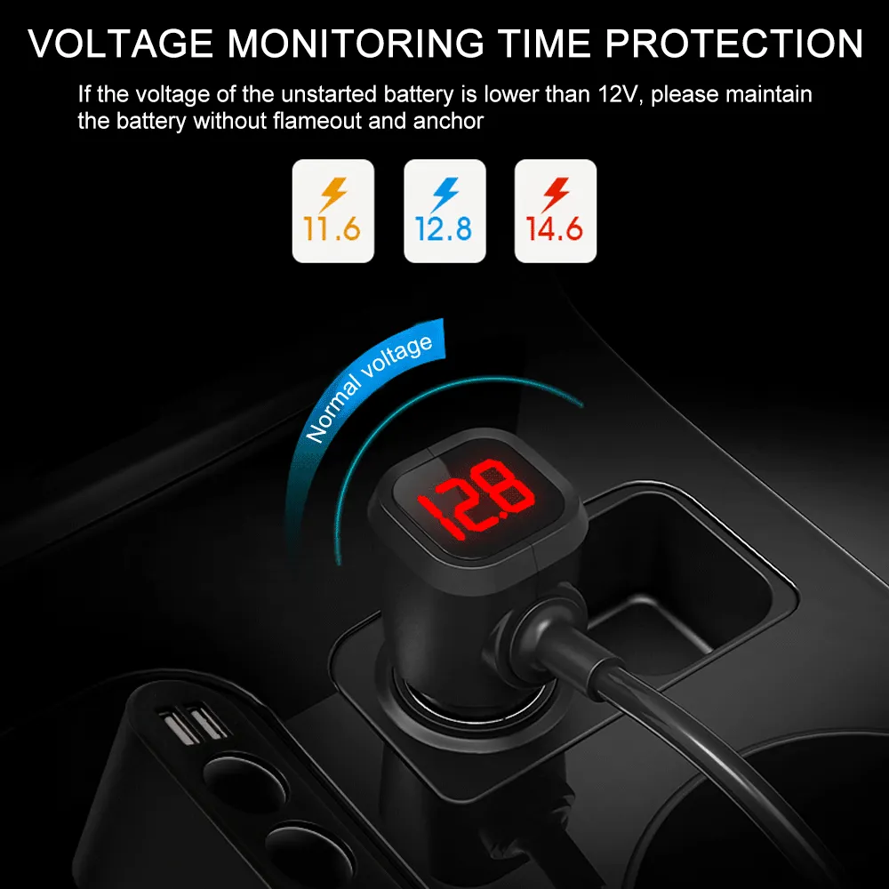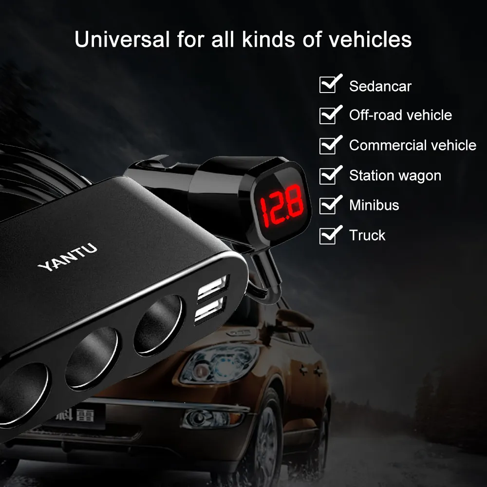A: [Voltage monitoring + metal car charger] 3 holes 2USB extension cable black,