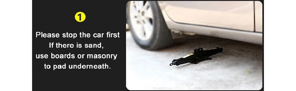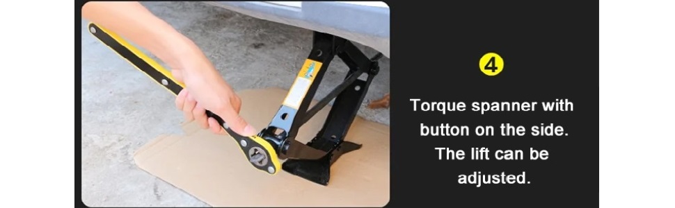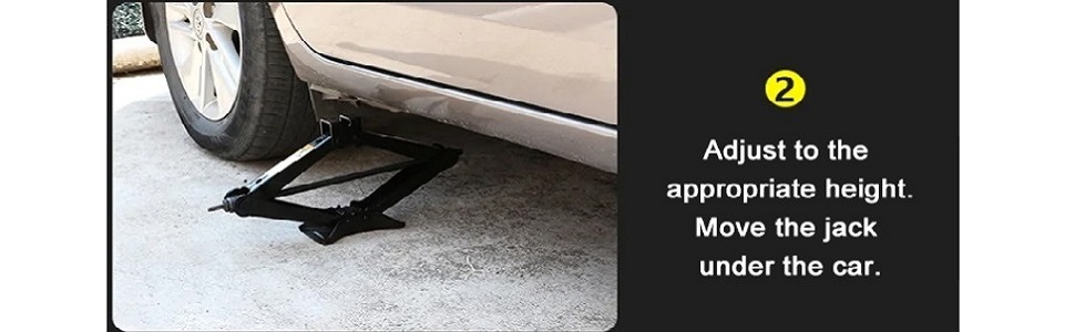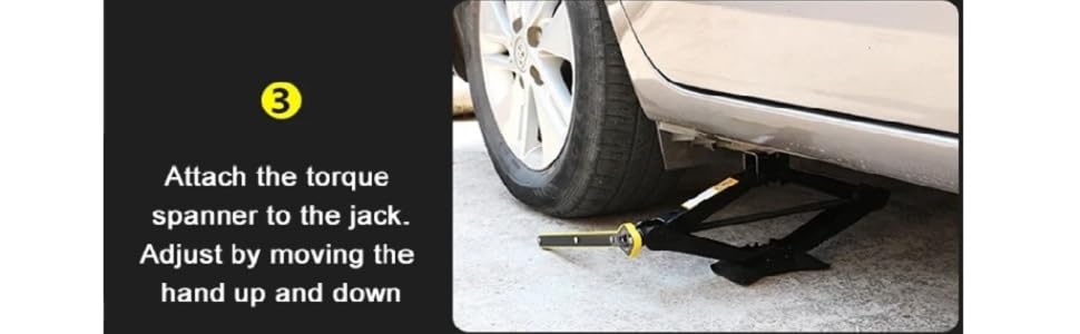 car jack lug wrench is designed with forward and reverse knobs, just put the handle into the screw hole, slowly turn the handle clockwise,