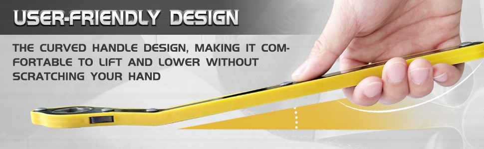 - Simple Operation: Simply insert the jack handle into the hole in the handle socket and push the handle clockwise to push the jack to the proper height. The slender handle conforms to the ergonomic design, and the reinforced ratchet head design is more strong and labor-saving.