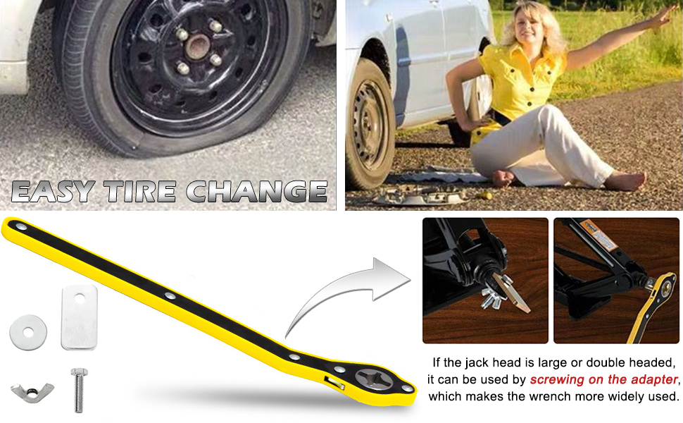 - Easy to Use: Great for travel use and emergency wheel/tire changes. The car jack wrench comes with an adapter, you can install the adapter on the universal joints for a perfect connection between the wrench and the universal joints. Both men and women can use it easily. It is one of the must-have tools for going out.