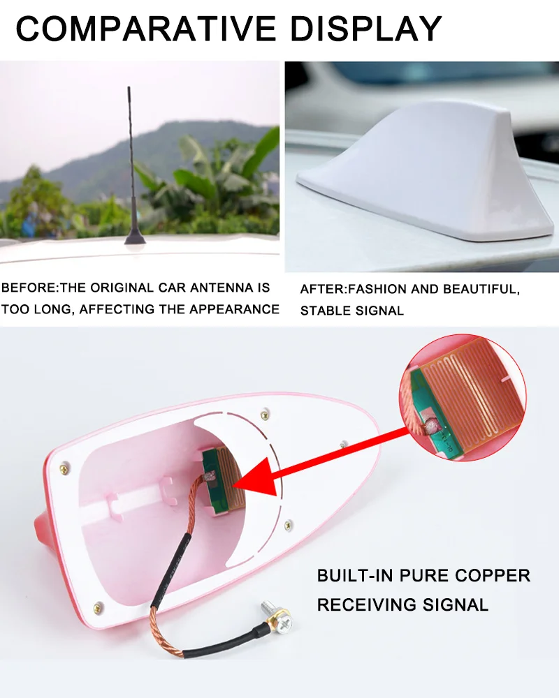 -Universal shark fin antenna, enhance the vehicle's signal with FM/AM connection cable inside and decorate your car, truck, SUV, etc. Please Note : The shark fin antenna is only suitable for flat car roofs, not for curved roofs.