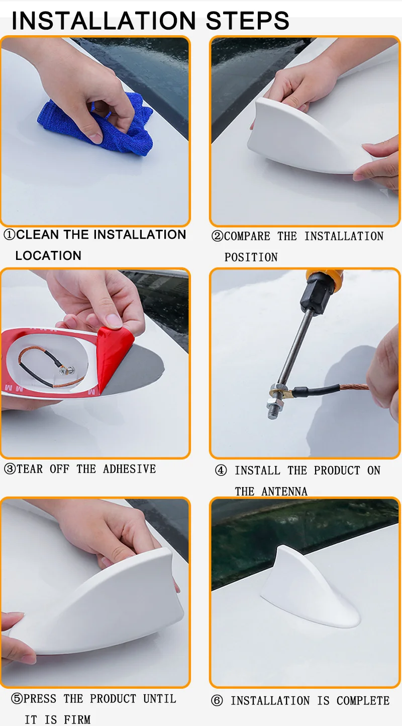 -Easy installation with the self-adhesive, no drilling required, just clean and dry your car, stick the fin on the surface, strong paste, not easy to fall off. Come with the needed screw to connect the wire to your antenna base and adhesive tape to ensure a good seal when mounting it over your existing antenna base.